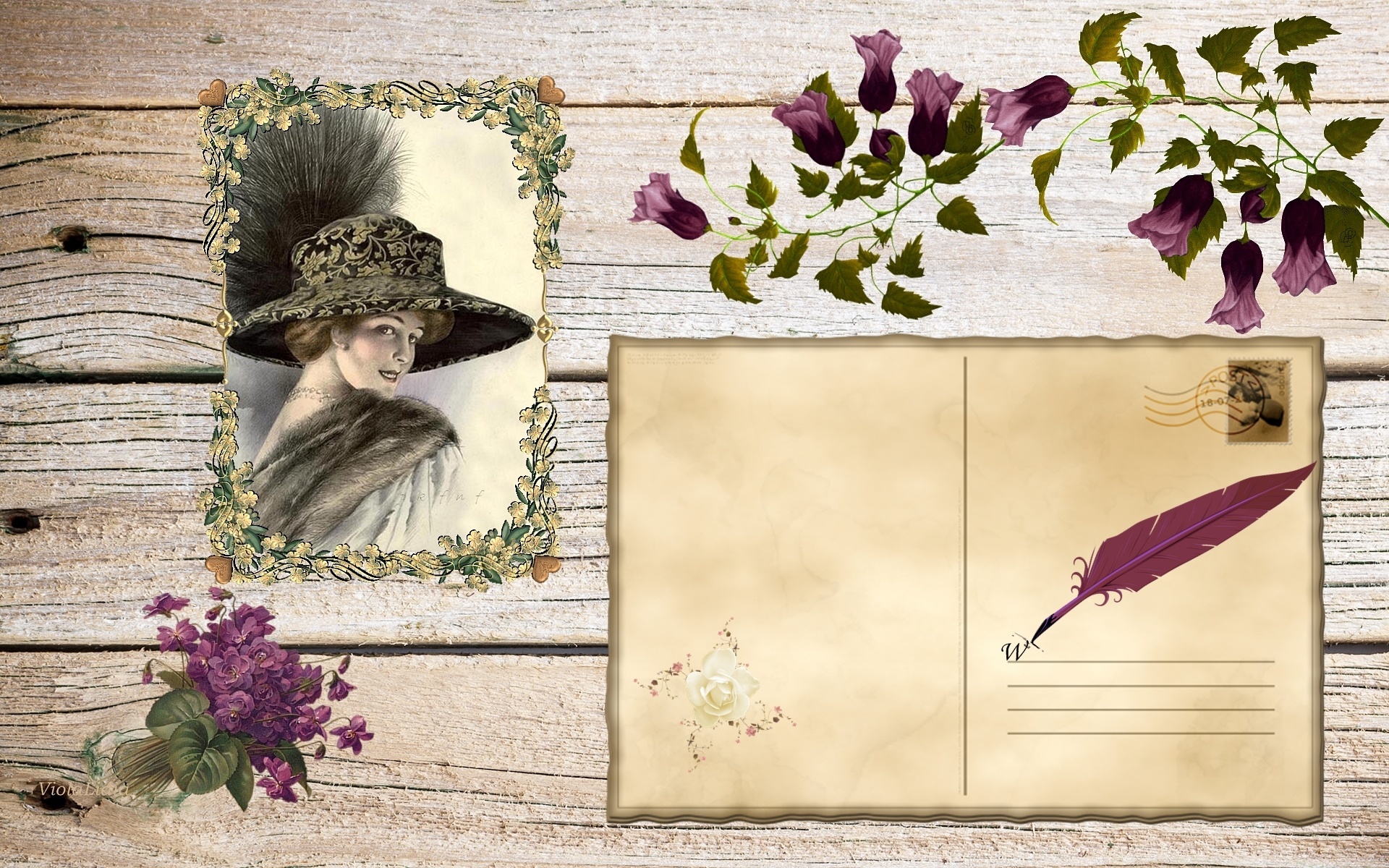 Edytor tapety: Grafika, Pocztówka, Kartka, Pióro, Kwiaty, Kobieta