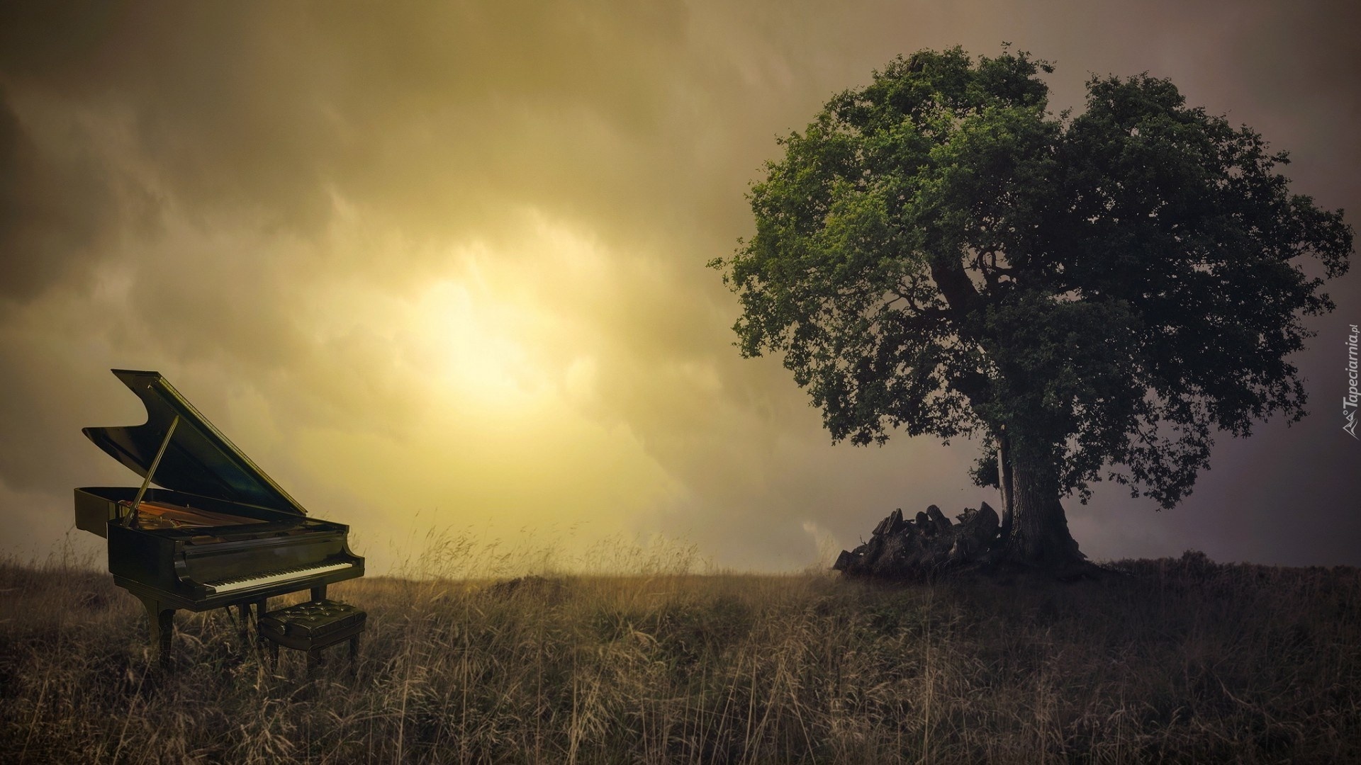 Edytor tapety: Zachód, Słońca, Chmury, Drzewo, Łąka, Fortepian