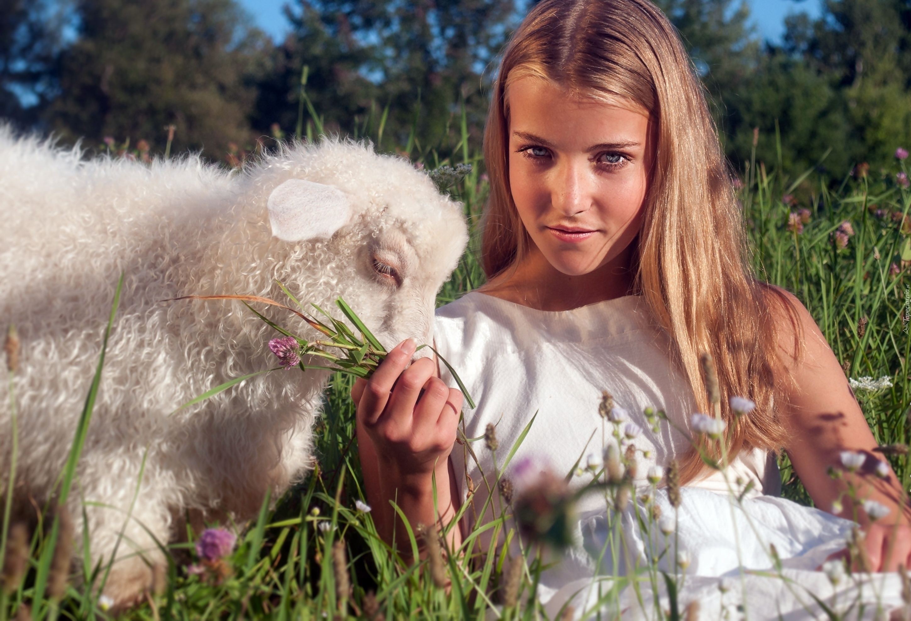 Edytor tapety: Kobieta, Owieczka, Lato, Łąka