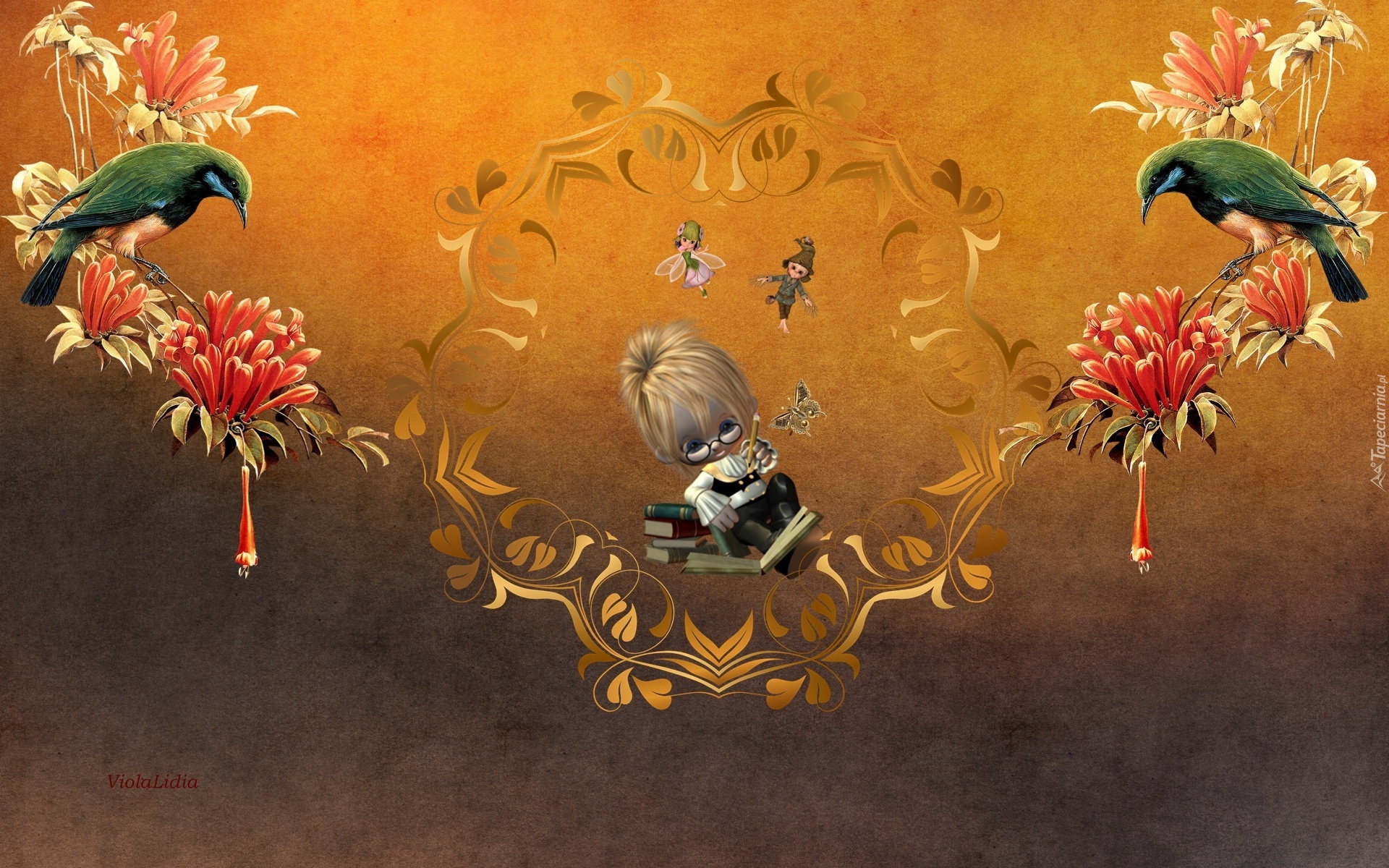 Edytor tapety: Grafika, Laleczka, Książki, Ptaki, Kwiaty