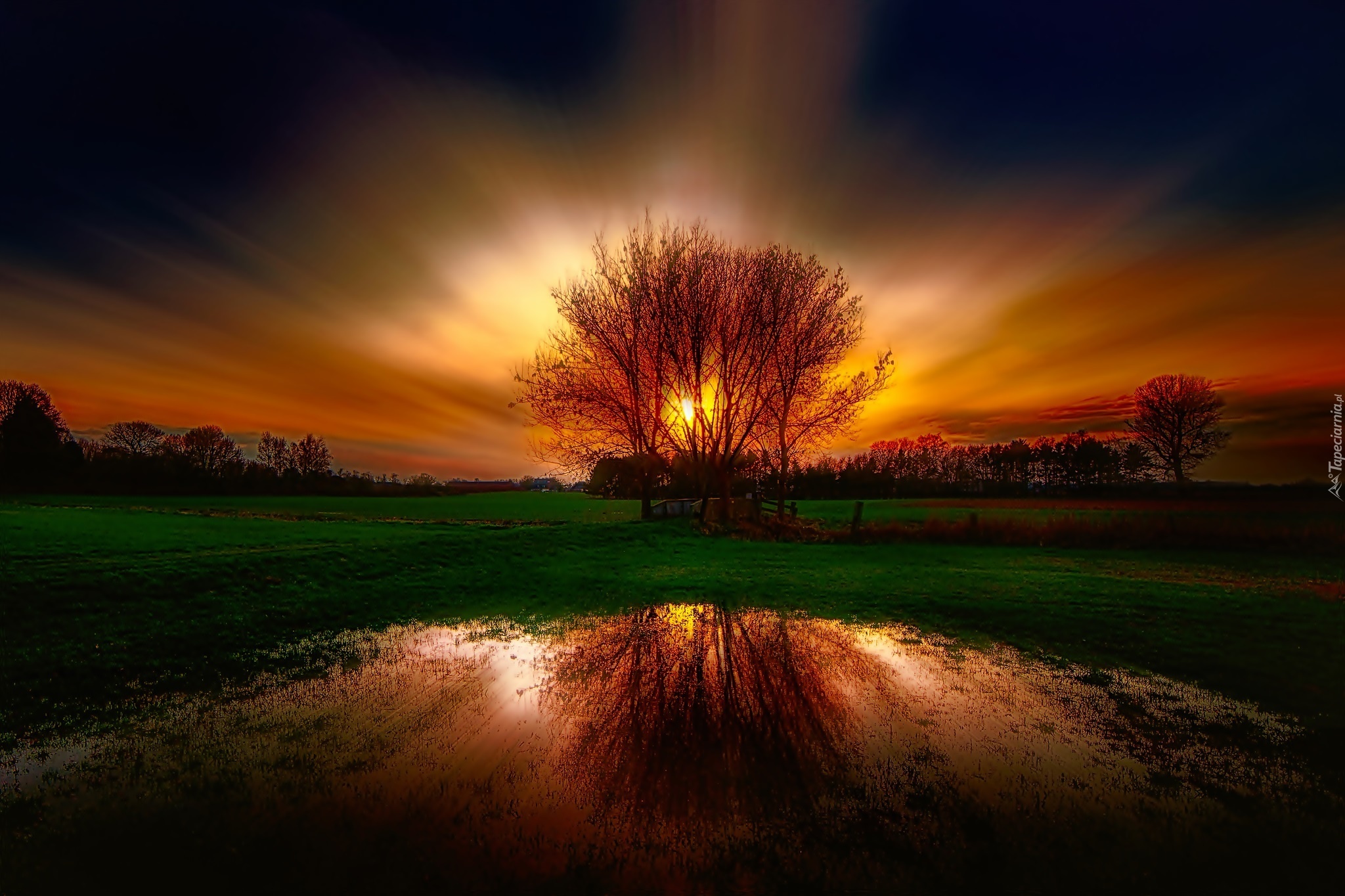 Edytor tapety: Zachód słońca , Łąka, Drzewa