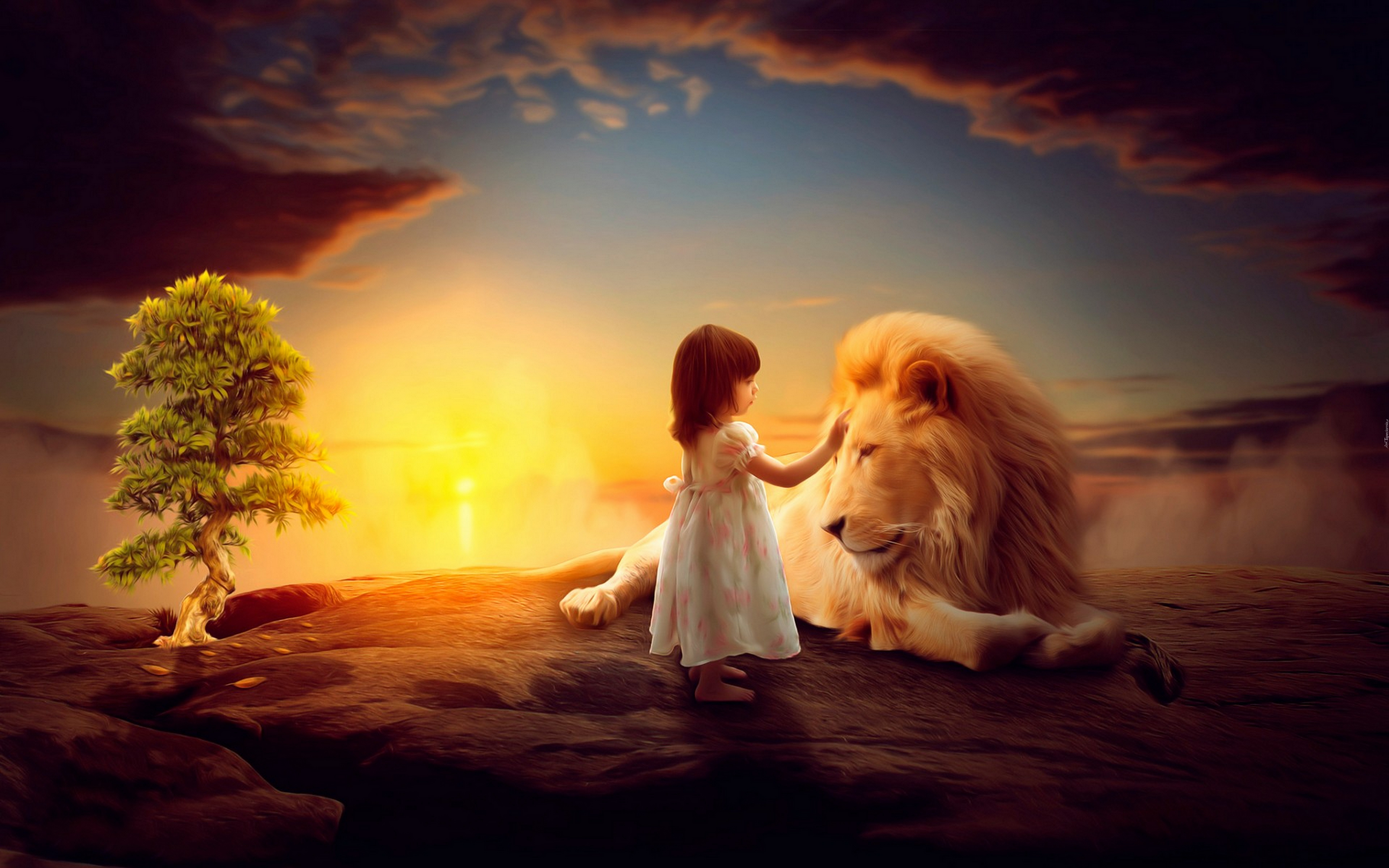 Edytor tapety: Dziewczynka, Lew, Drzewko, Chmury