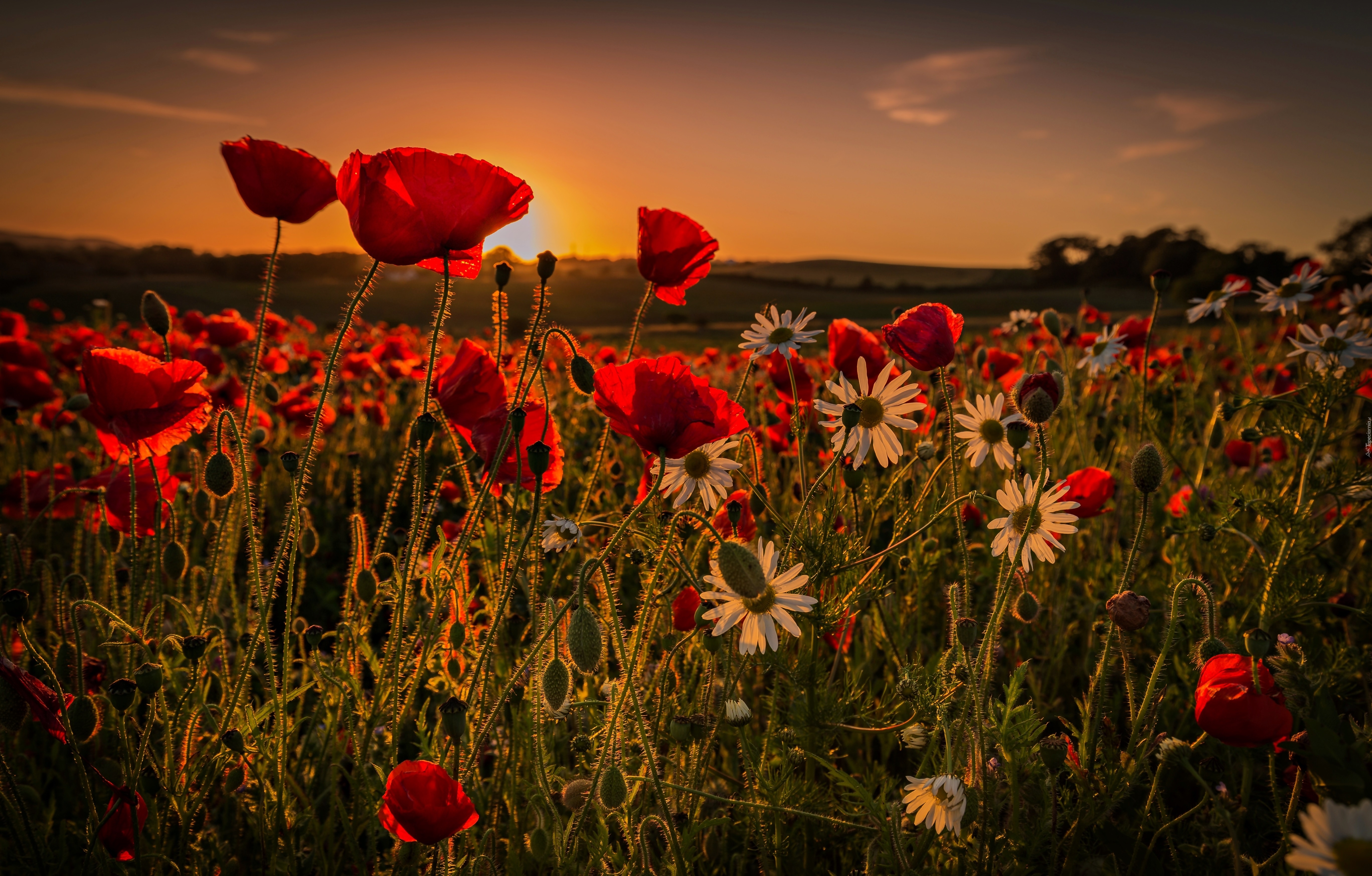 Edytor tapety: Lato, Łąka, Zachód, Słońca, Maki, Rumianki