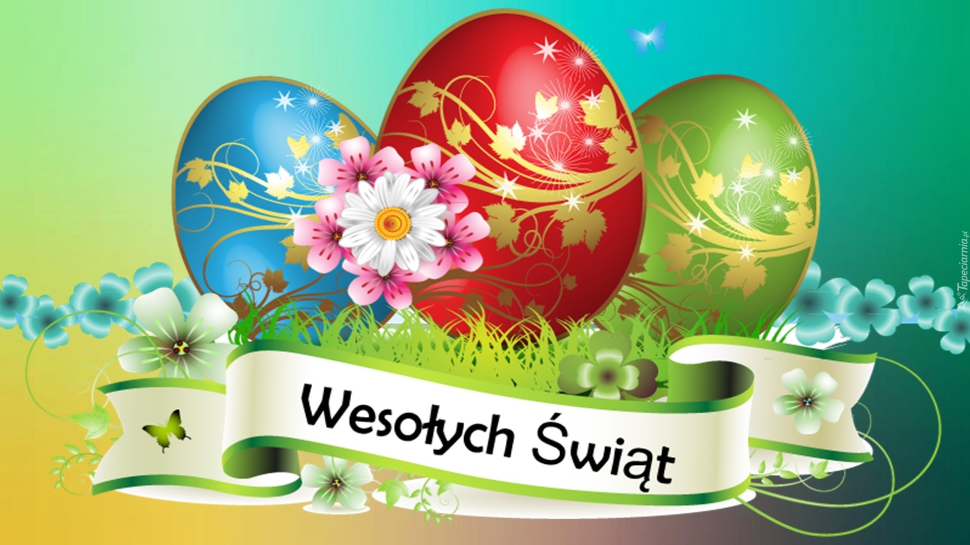 Edytor tapety: Wielkanoc, Pisanki, Kwiaty, Wstążka