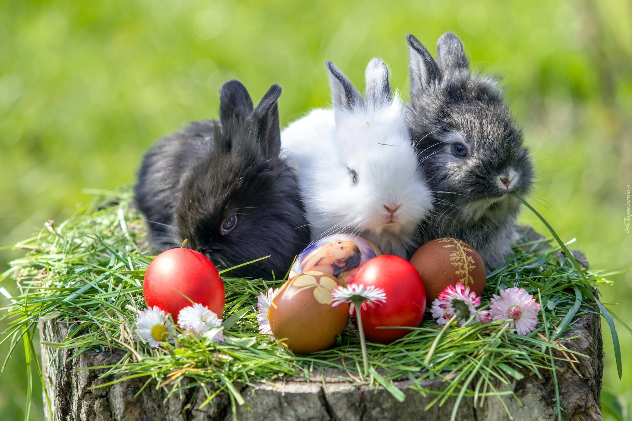Edytor tapety: Króliki, Jajka, Wielkanocne, Stokrotki, Trawa, Pień, Drzewa