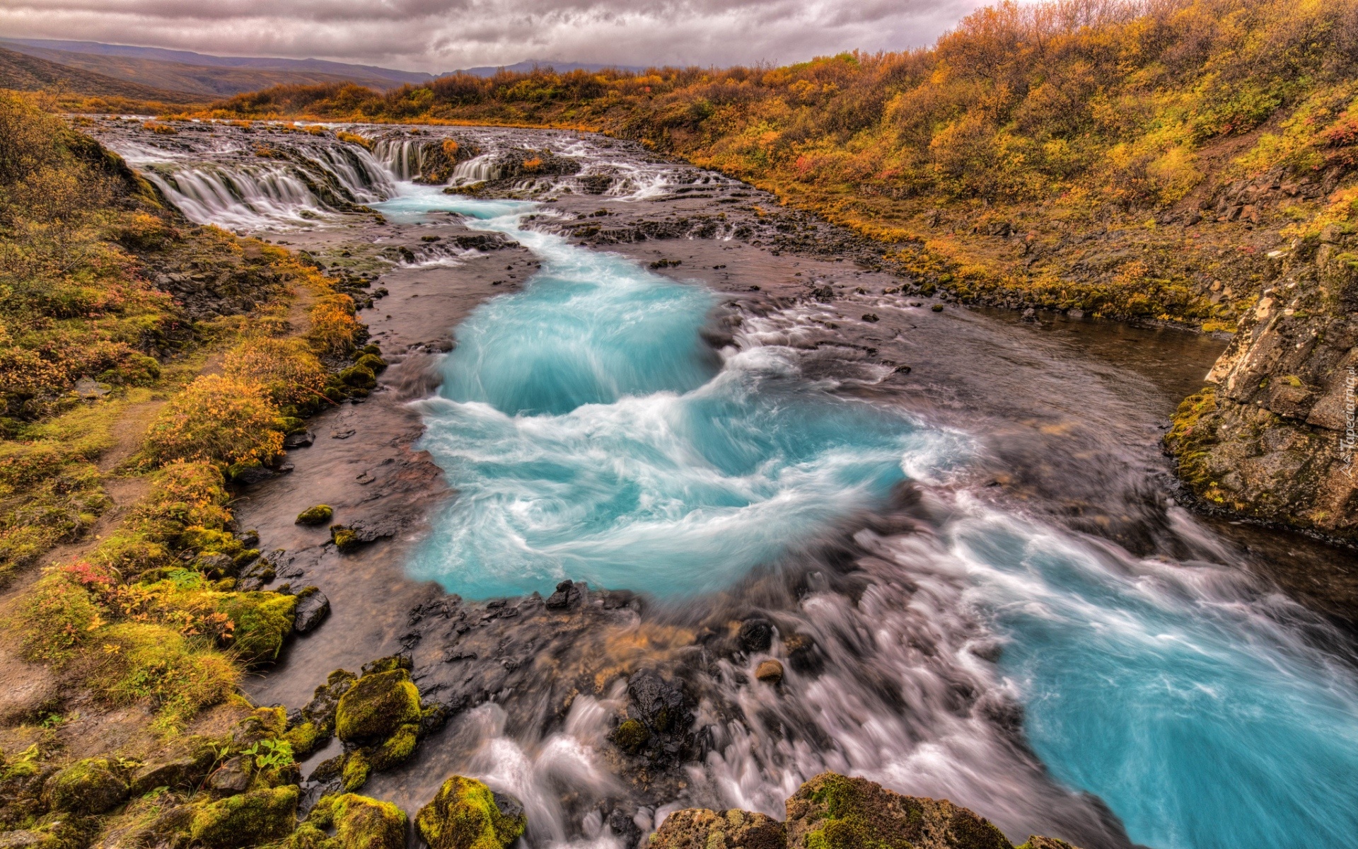 Edytor tapety: Wodospady, Rwąca, Rzeka, Kamienie, Zarośla