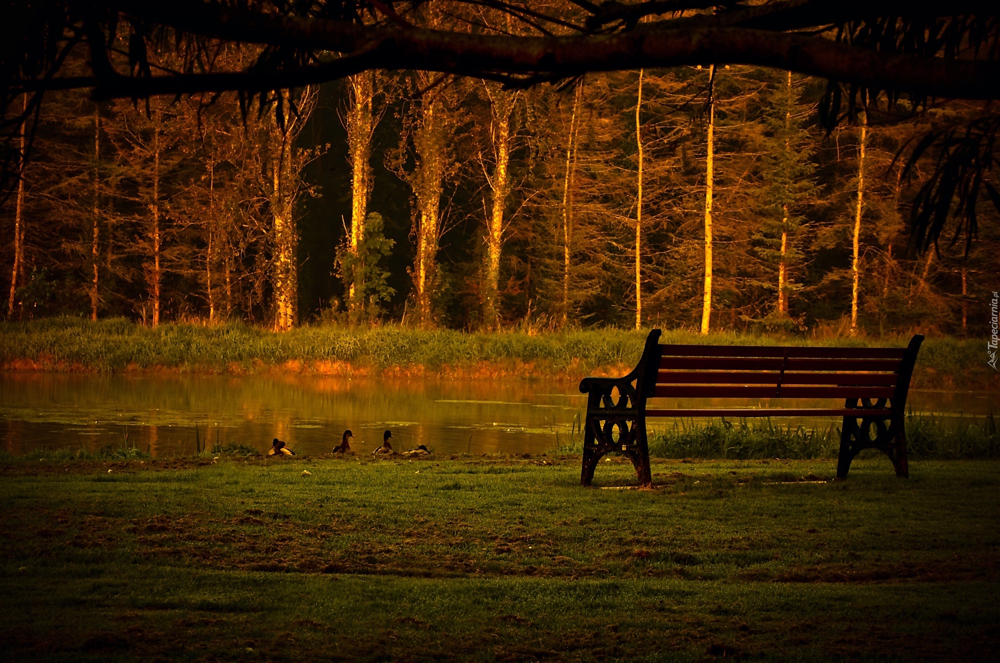 Edytor tapety: Ławka, Staw, Las, Zachód Słońca