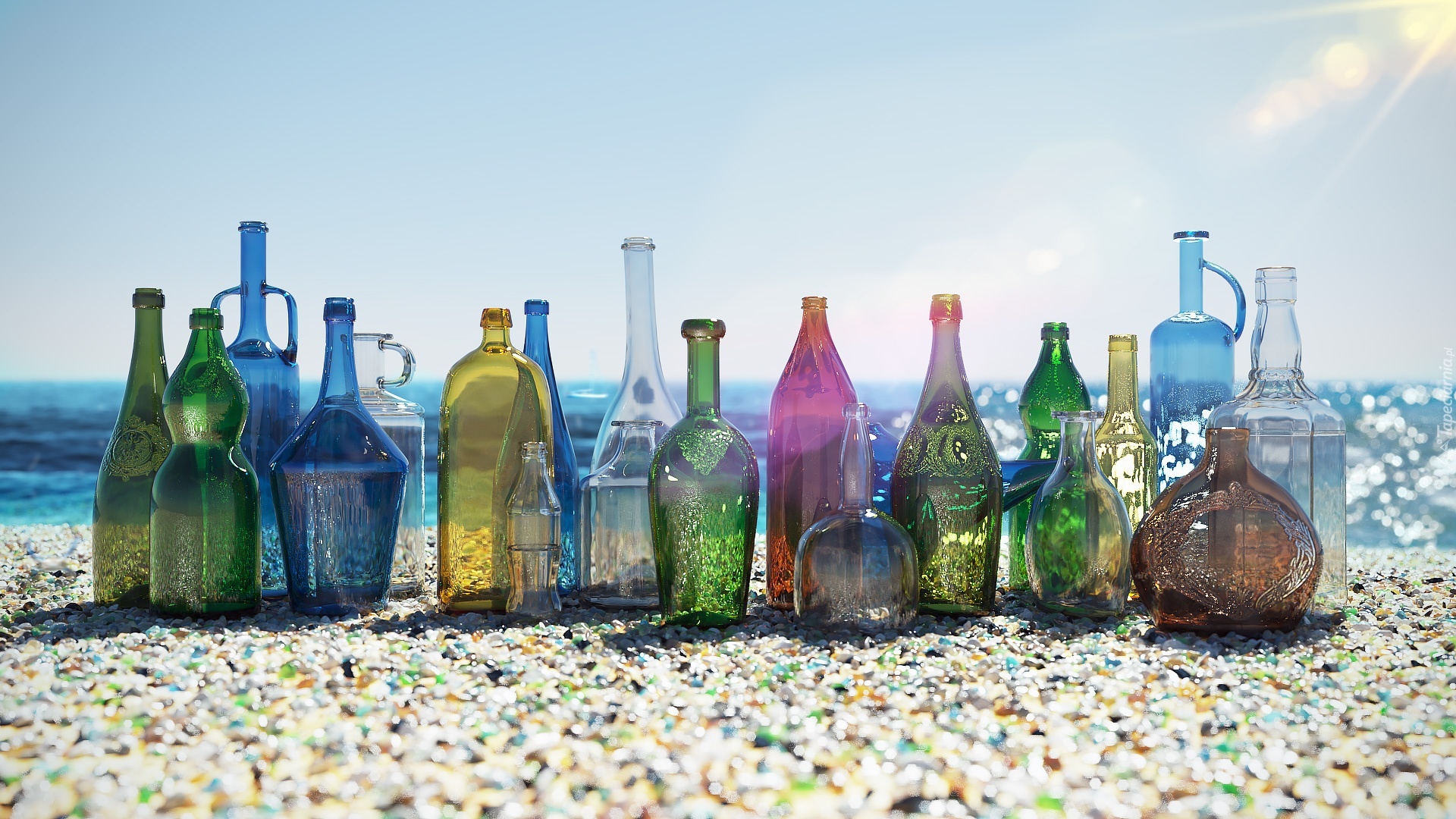 Edytor tapety: Kolorowe, Szklane, Butelki, Plaża, Lato