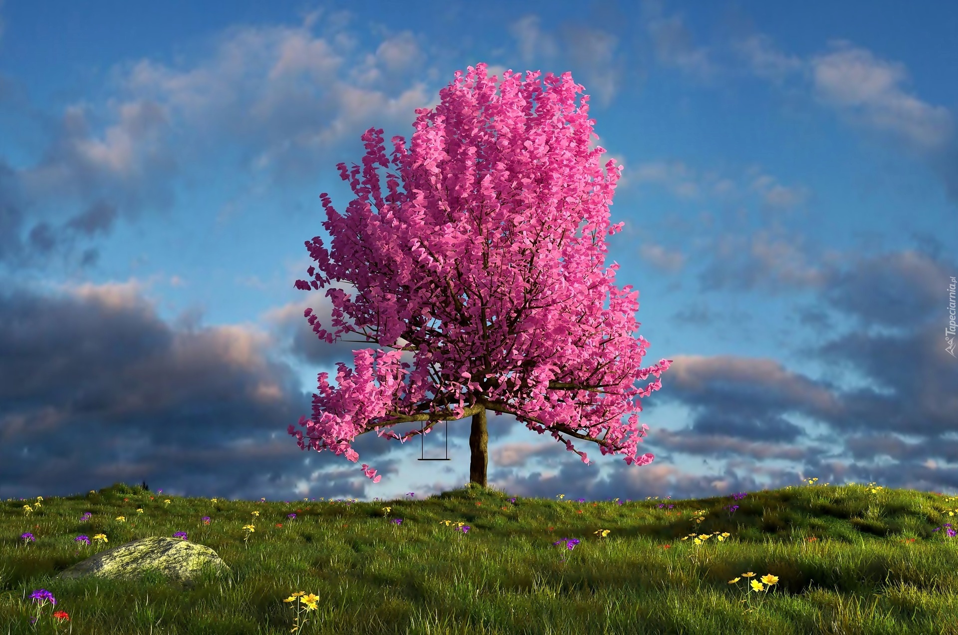 Edytor tapety: Różowe, Kwitnące, Drzewo, Łąka, Huśtawka, Niebo