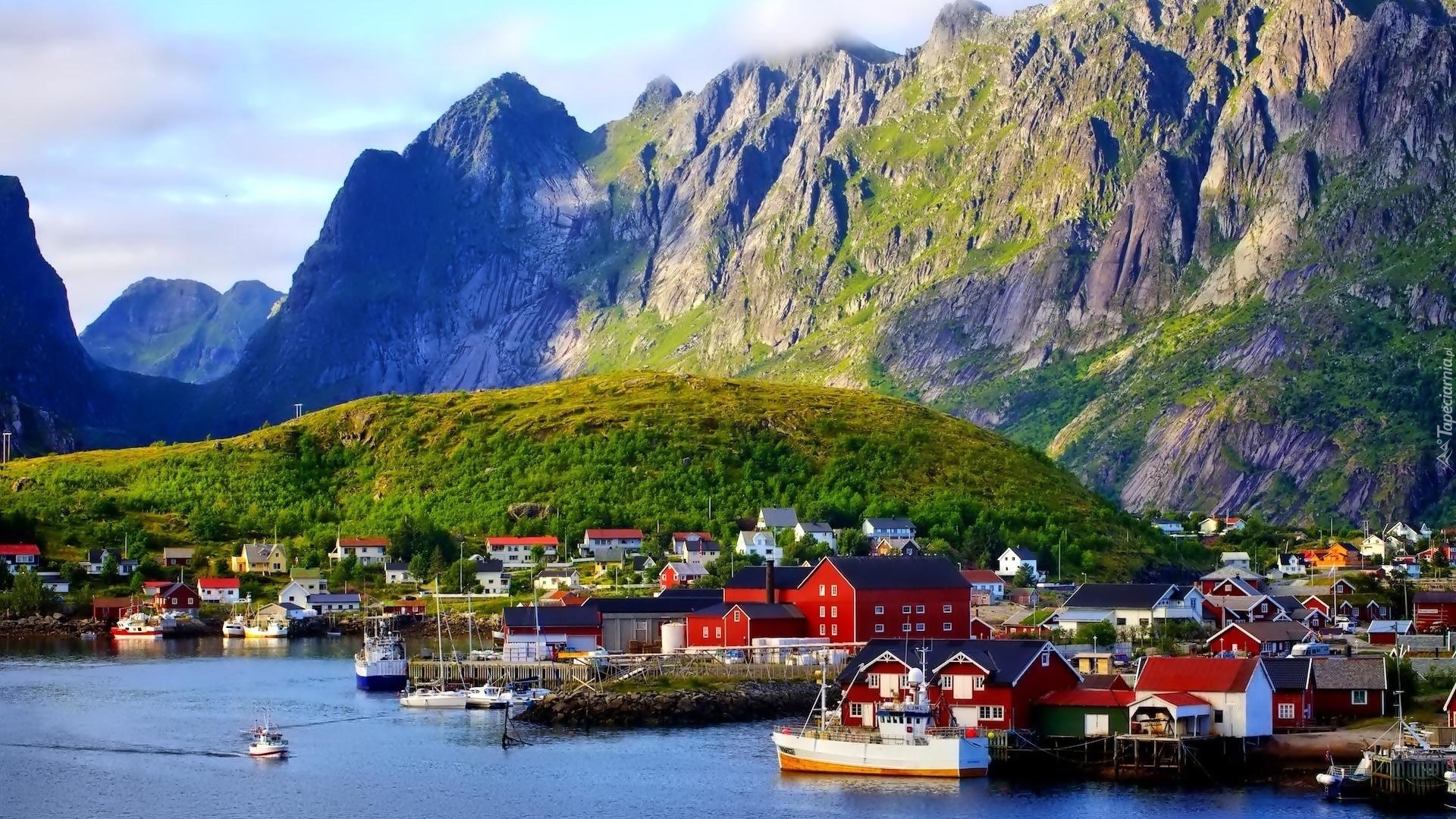 Edytor tapety: Wieś, Nad, Morzem, Góry, Port, Statki, Norwegia