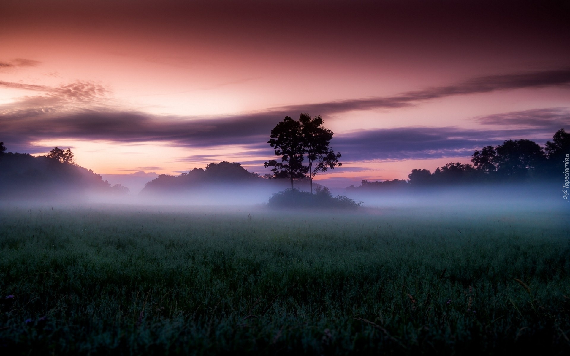 Edytor tapety: Wschód Słońca, Pola, Mgła, Drzewa