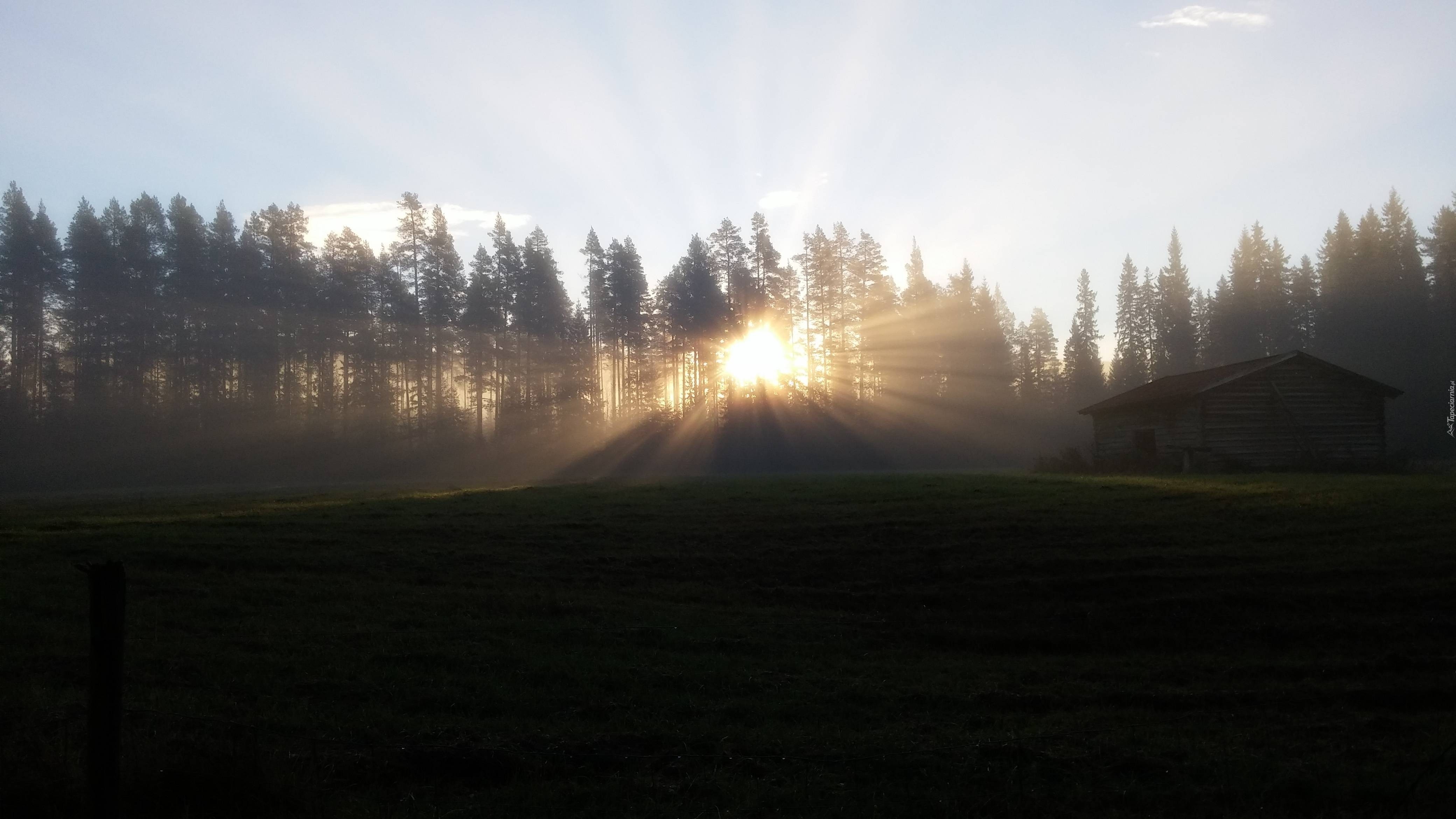 Edytor tapety: Wschód Słońca, Las, Łąka, Mgła, Dom