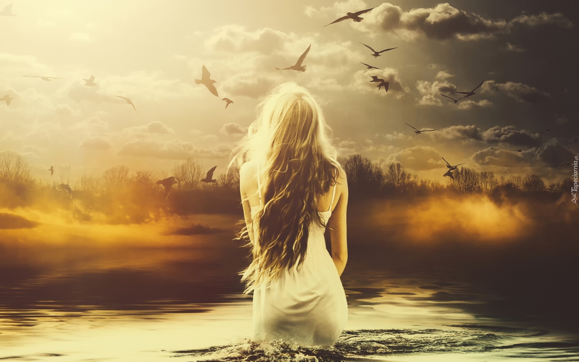 Edytor tapety: Dziewczyna, Woda, Ptaki
