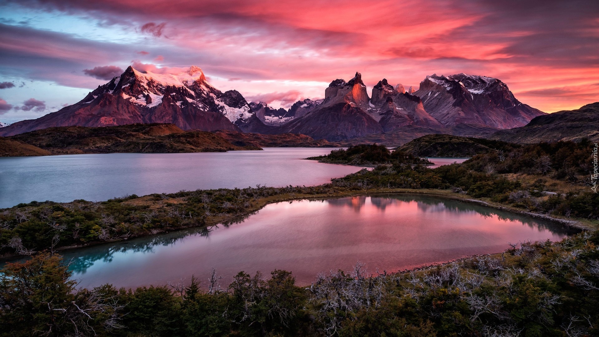 Edytor tapety: Zachód, Słońca, Góry, Jeziora, Las, Chmury