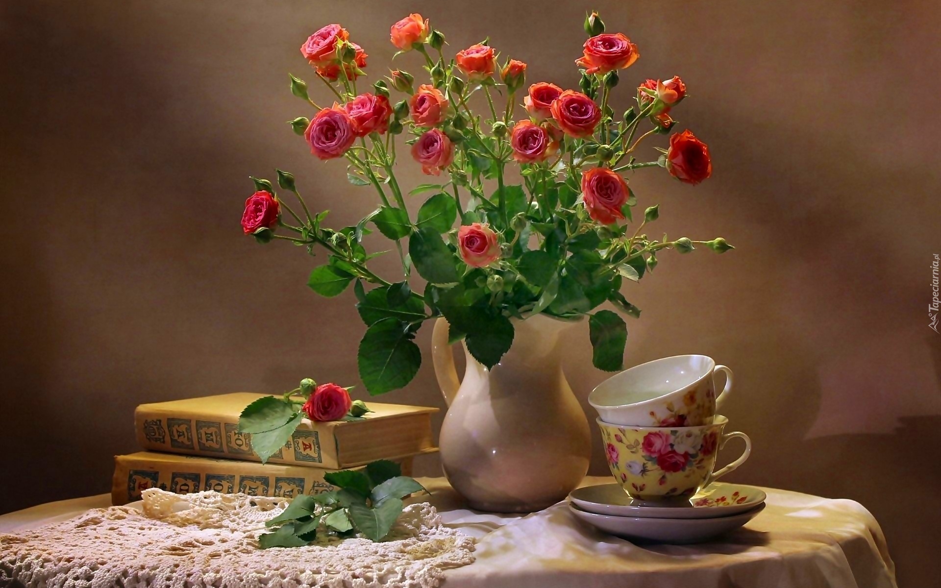 Edytor tapety: Kompozycja, Książki, Filiżanki, Bukiet, Kwiaty