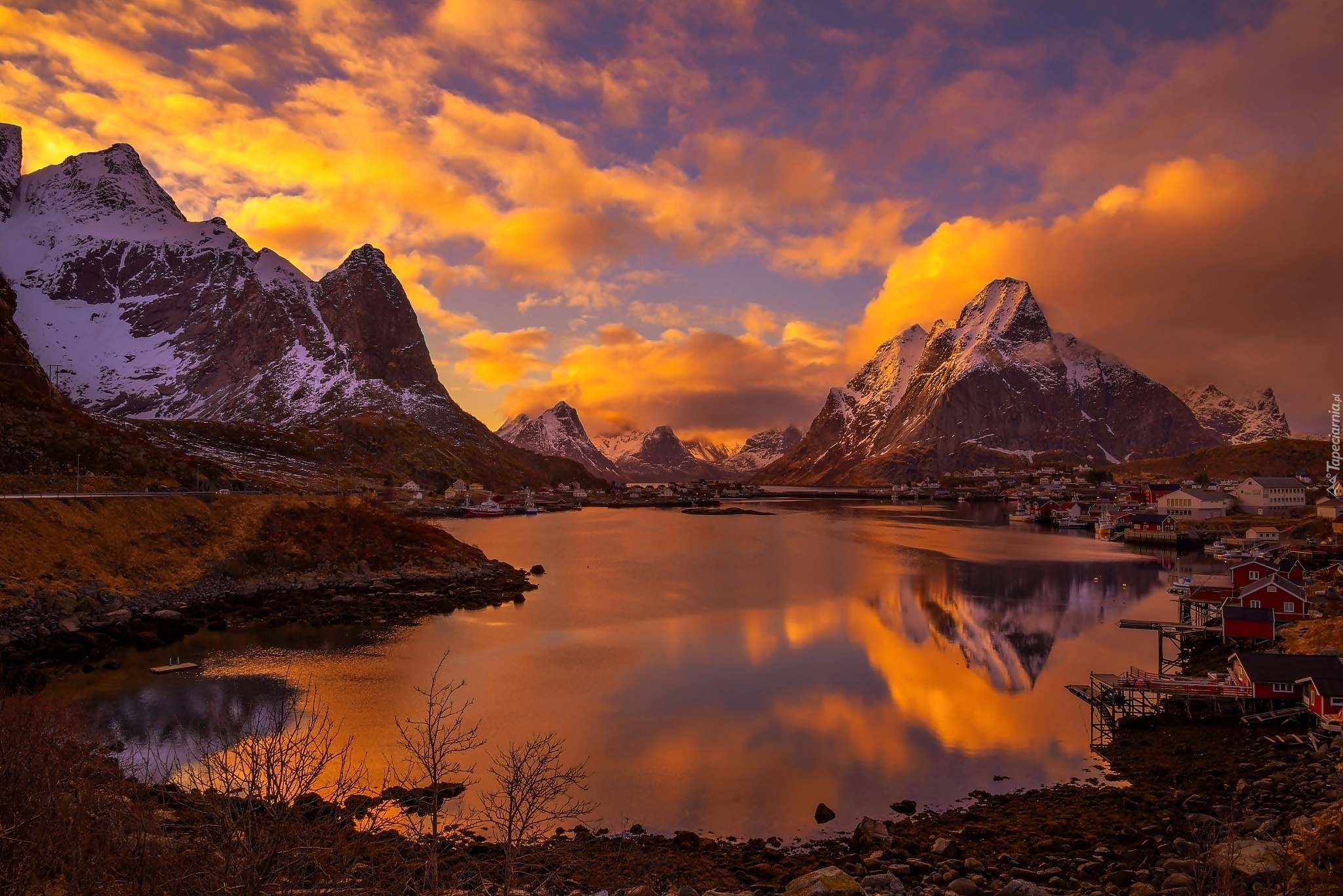 Edytor tapety: Norwegia, Chmury, Świt, Góry, Wioska Reine, Lofoty