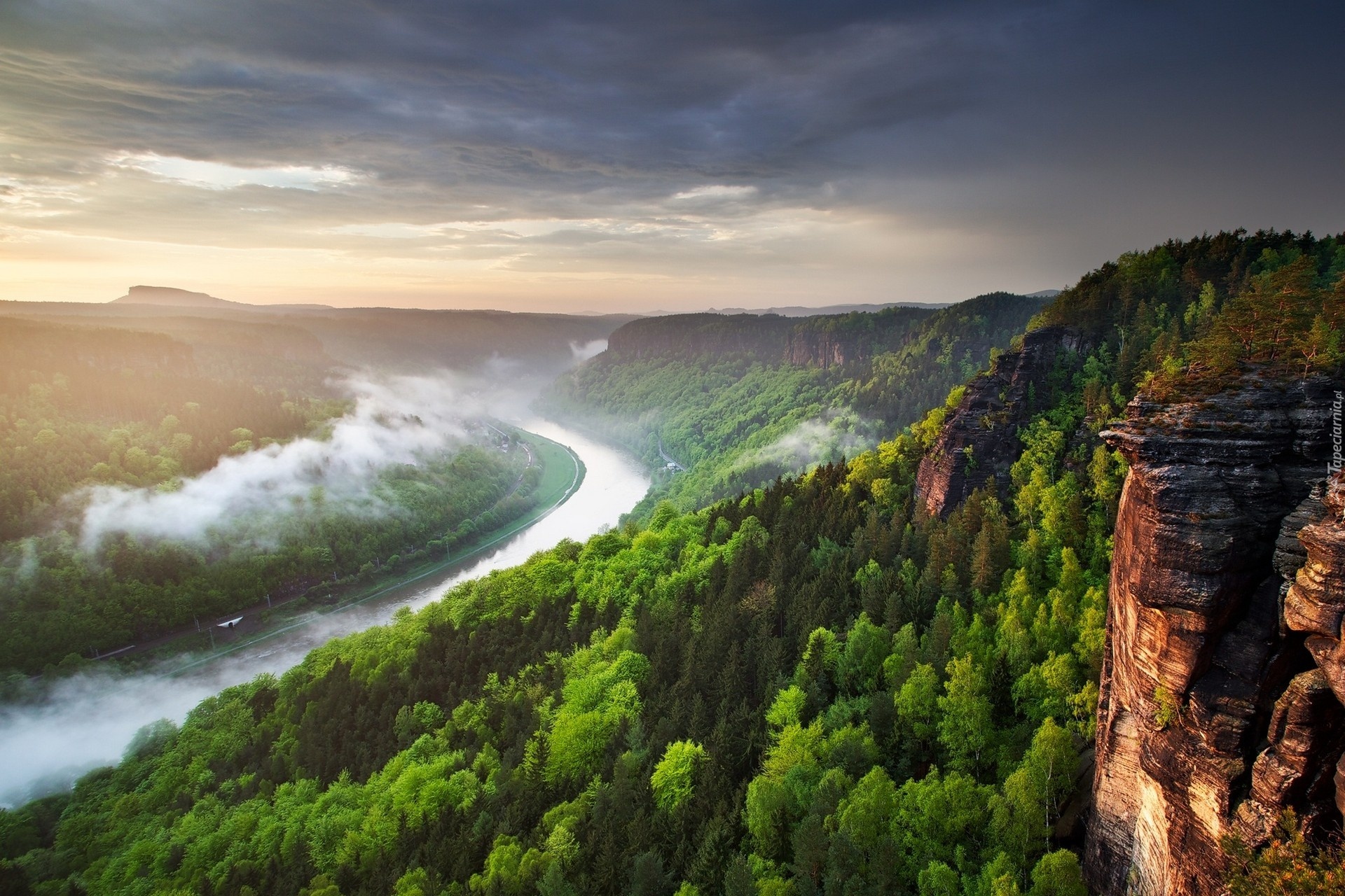 Edytor tapety: Rzeka, Góry, Skały, Las, Mgła