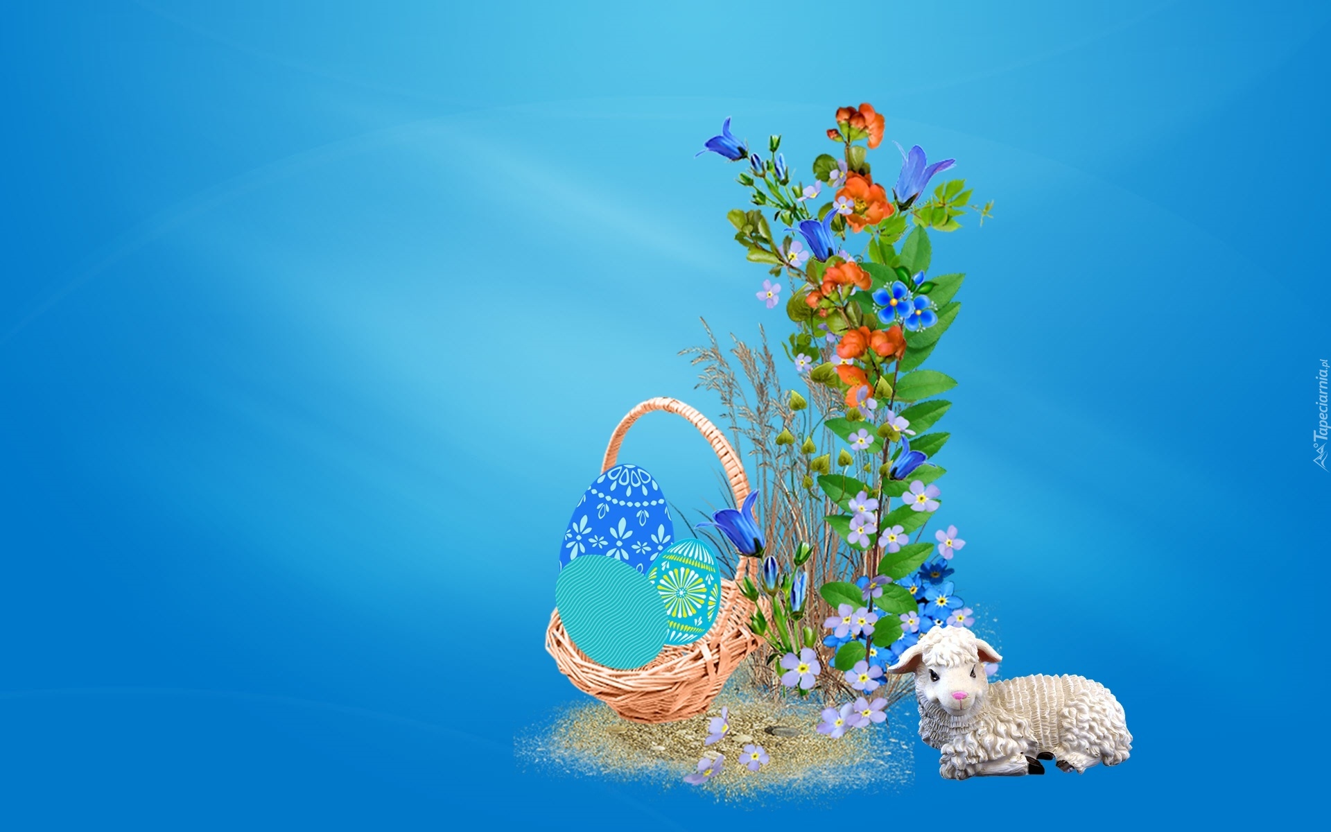 Edytor tapety: Wielkanoc, Kosz, Pisanki, Baranek, Kwiaty