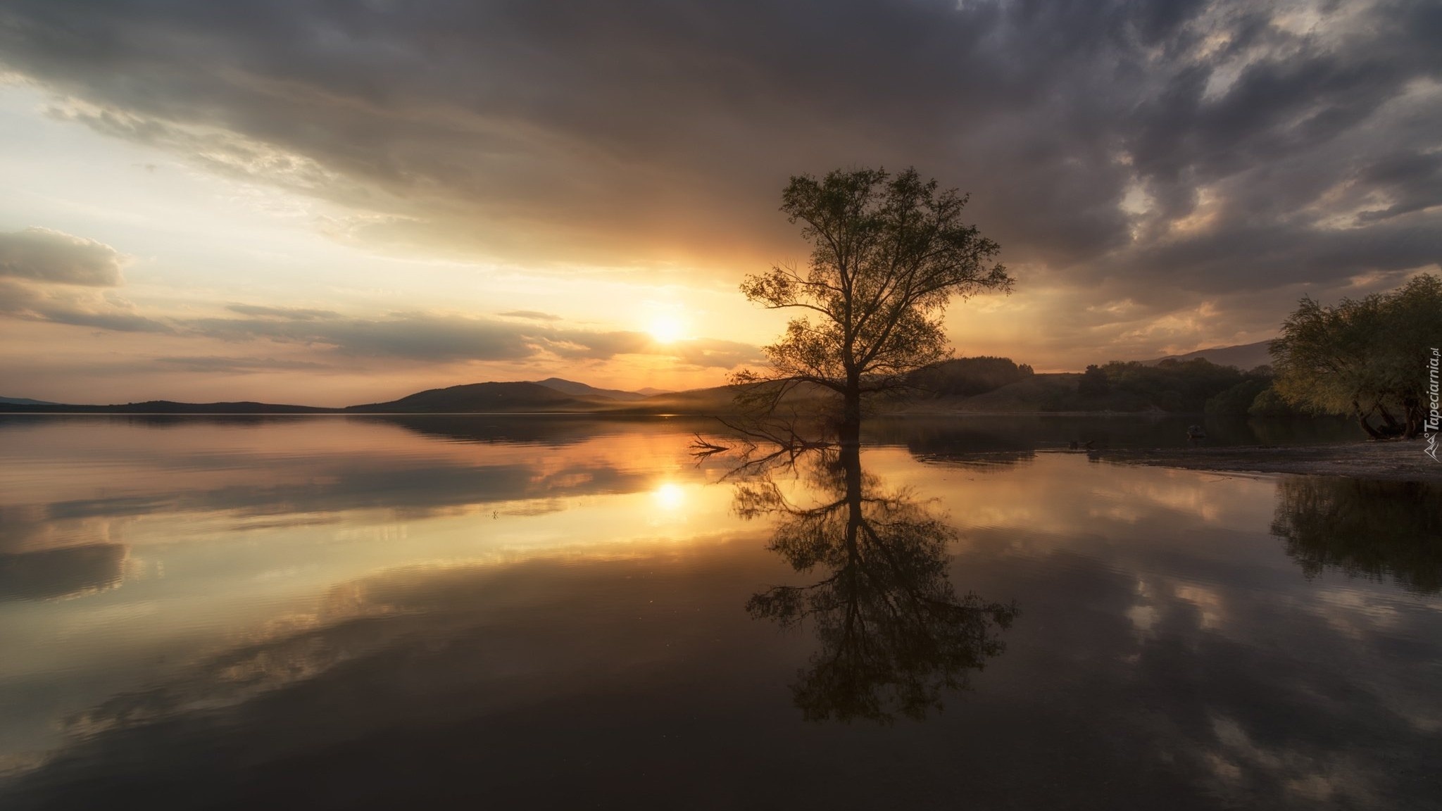 Edytor tapety: Jezioro, Jesień, Zachód słońca, Drzewa, Odbicie