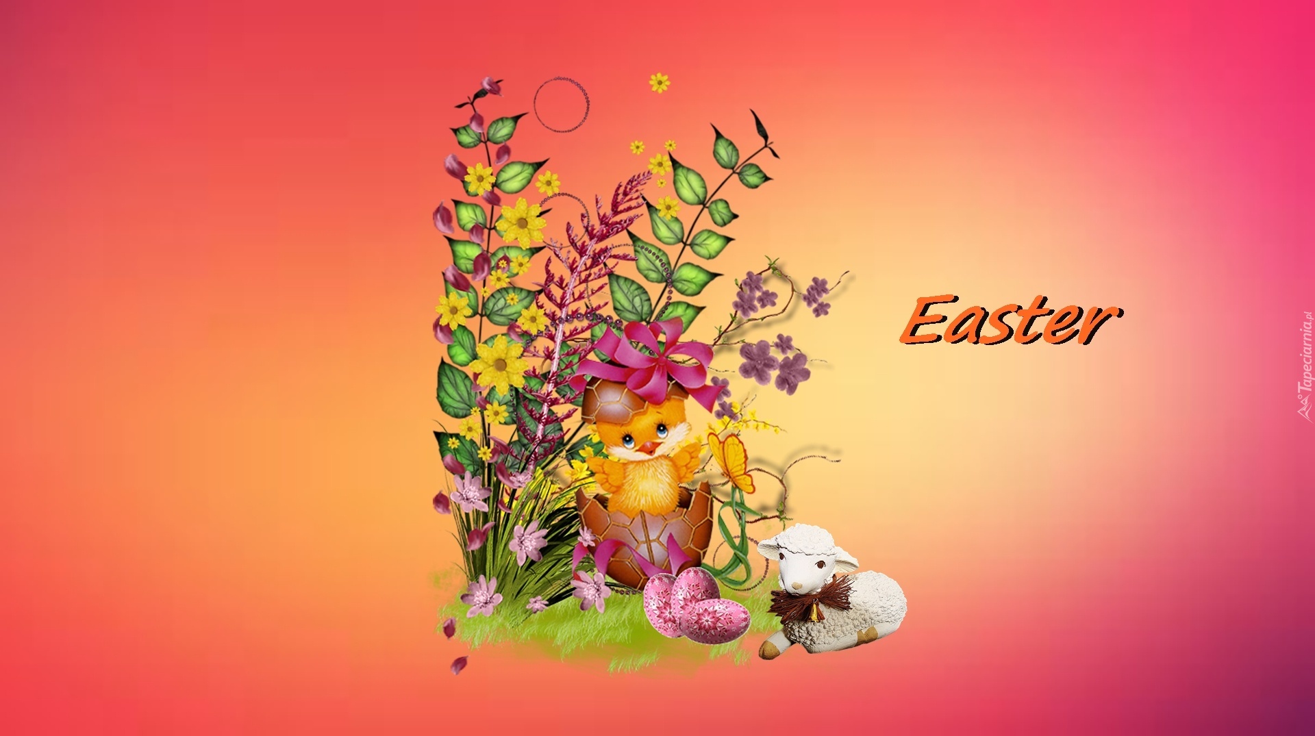 Edytor tapety: Wielkanoc, Pisanki, Pisklę, Baranek, Gałązki