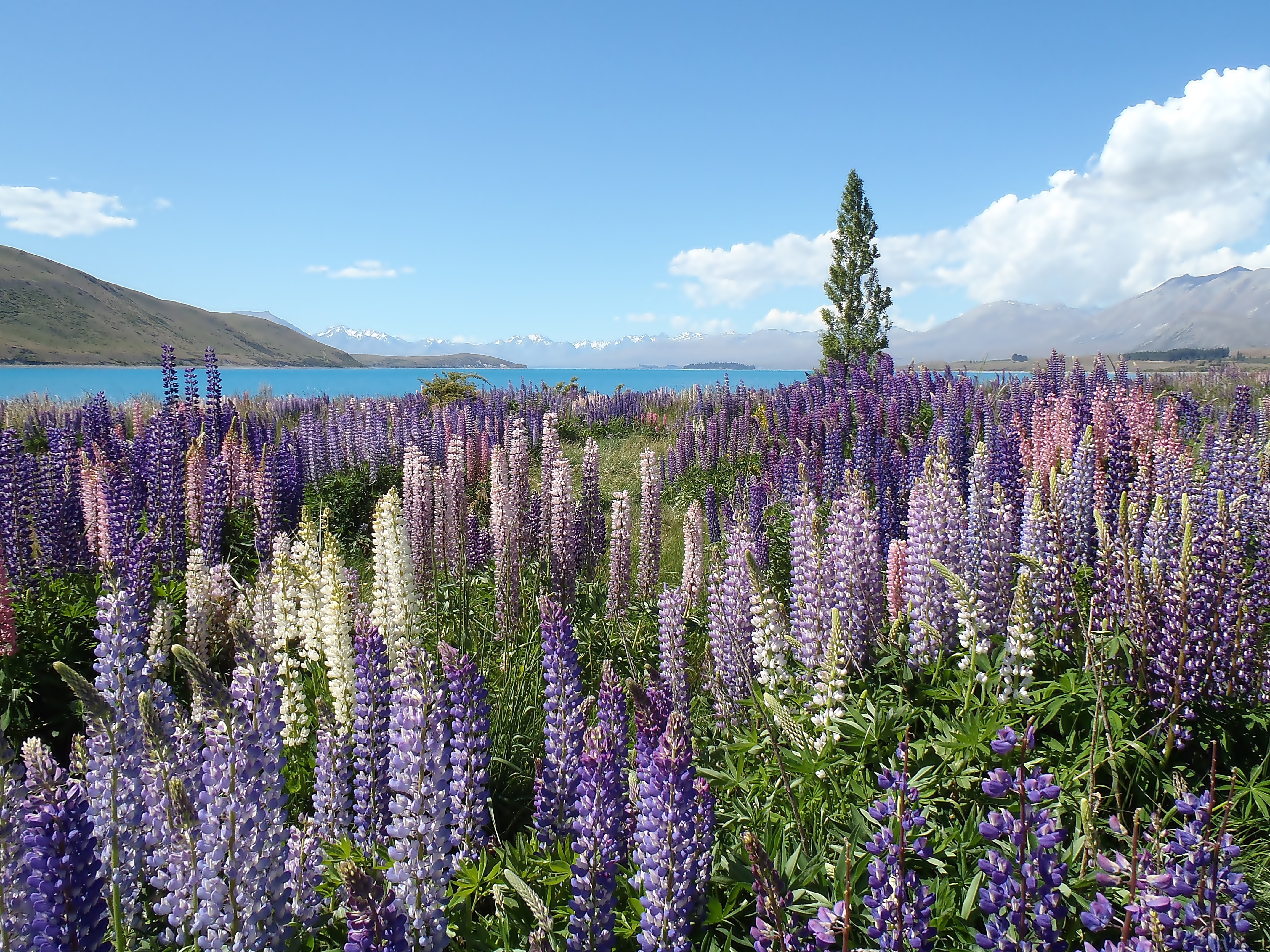 Edytor tapety: Łąka, Kolorowy, Łubin, Jezioro, Góry, Lato