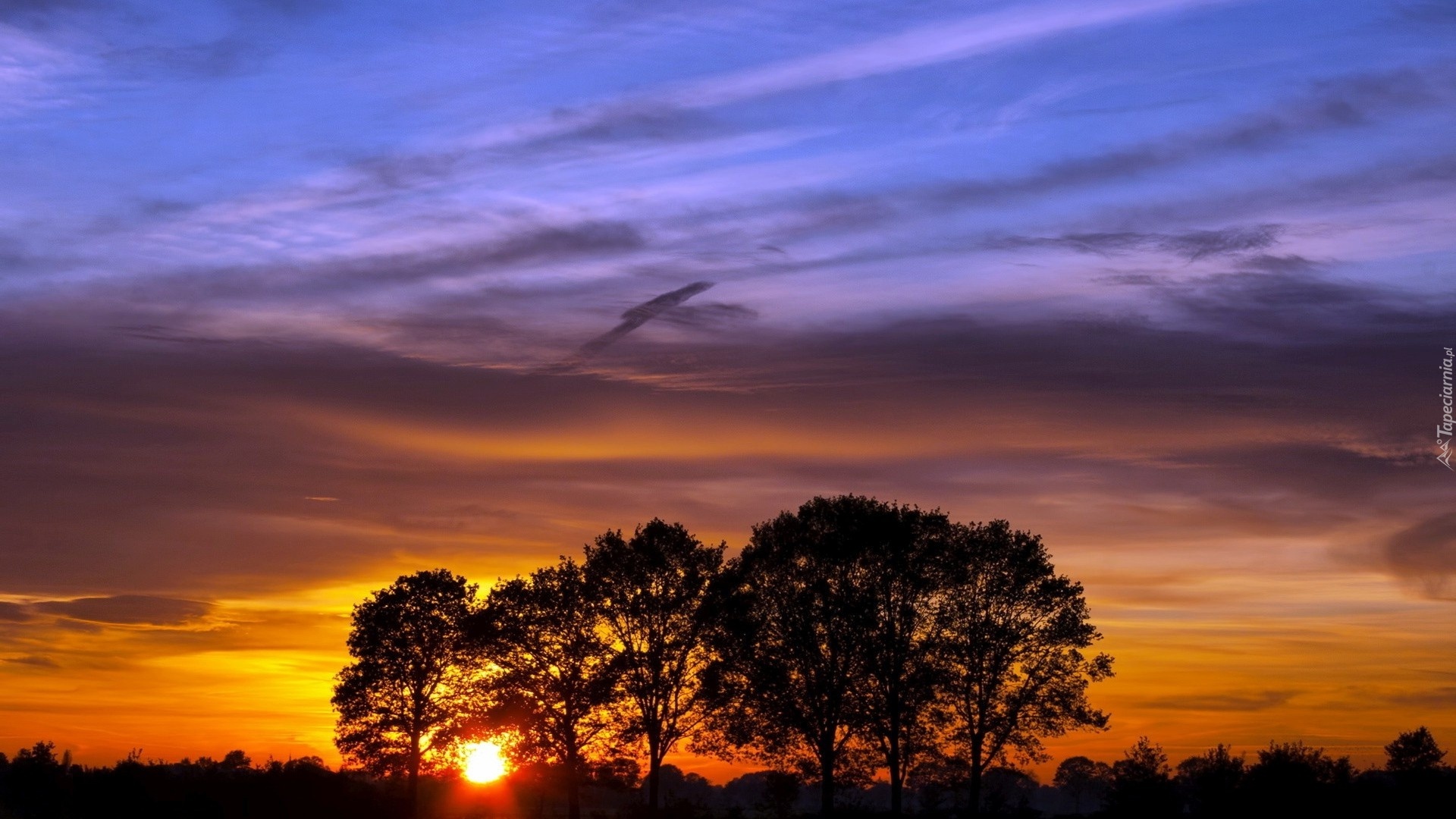 Edytor tapety: Zachód słońca, Niebo, Chmury, Drzewa