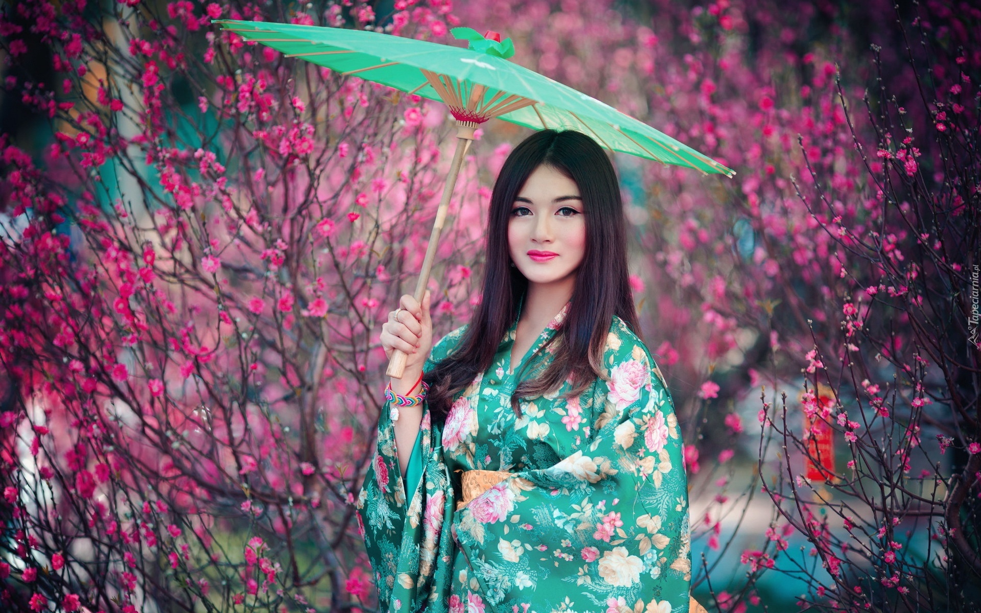Edytor tapety: Brunetka, Kobieta, Makijaż, Kimono, Kwiaty, Parasolka