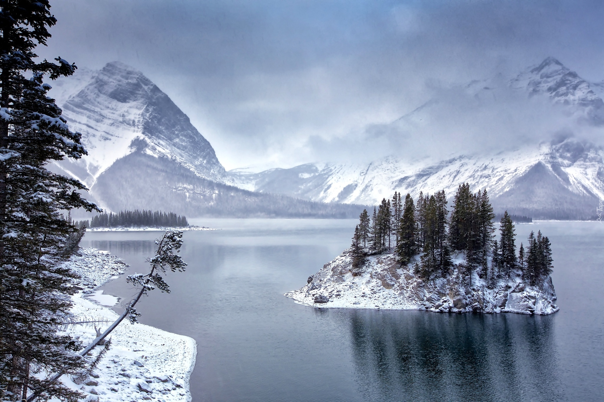 Edytor tapety: Zima, Góry, Jezioro, Drzewa, Mgła