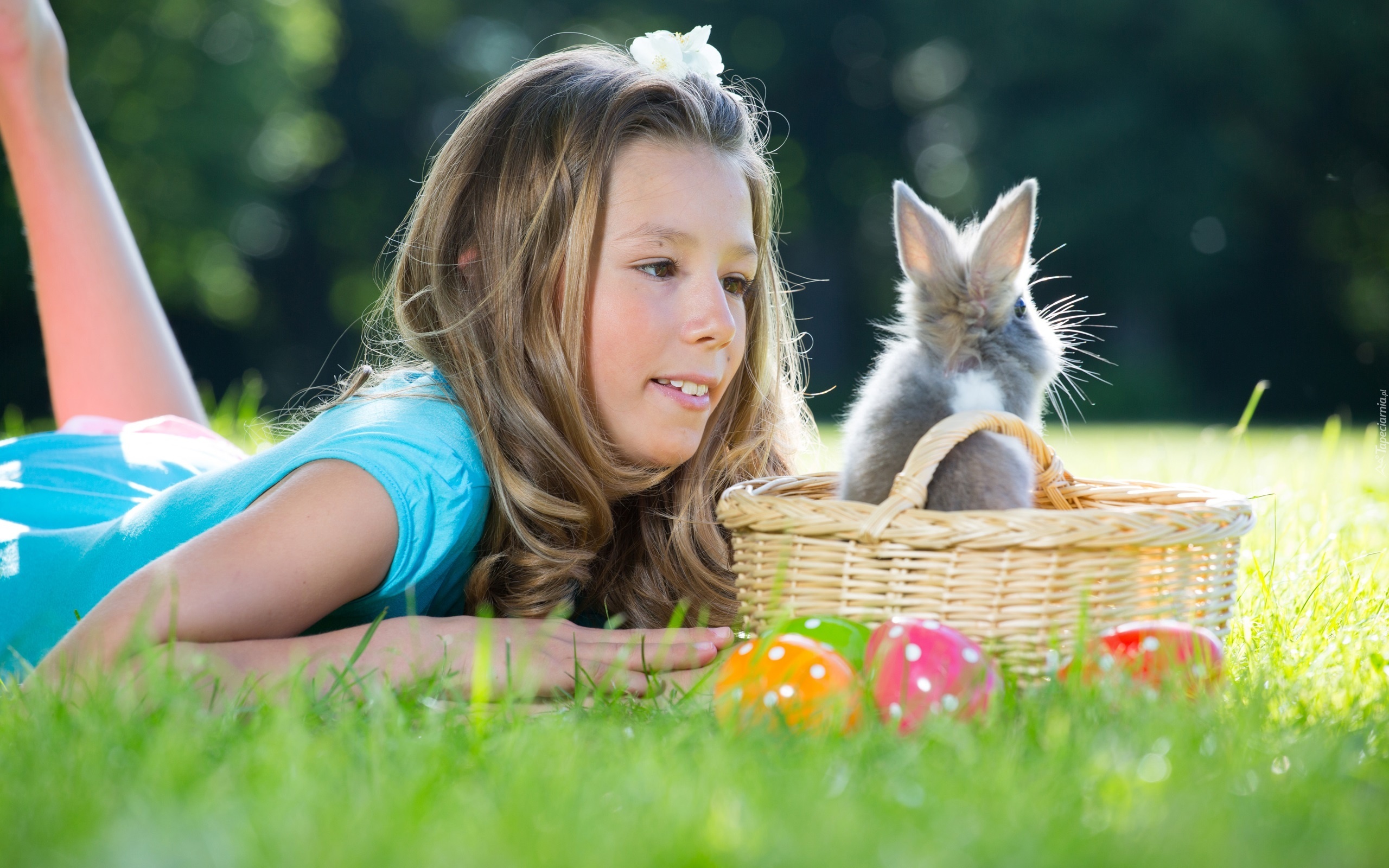 Edytor tapety: Łąka, Dziewczynka, Królik, Koszyk, Pisanki
