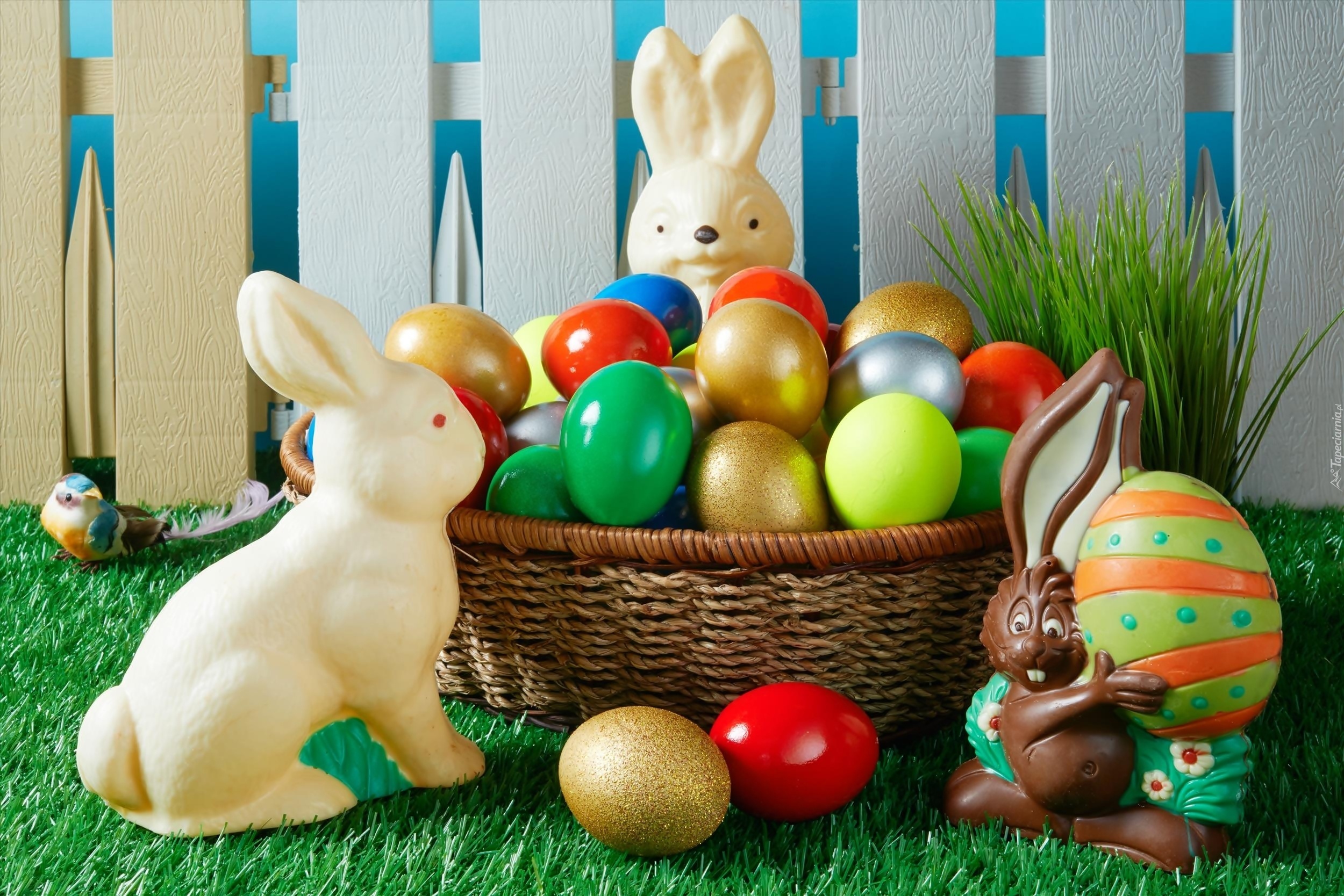Edytor tapety: Zajączki, Kolorowe, Pisanki, Koszyk, Wielkanoc