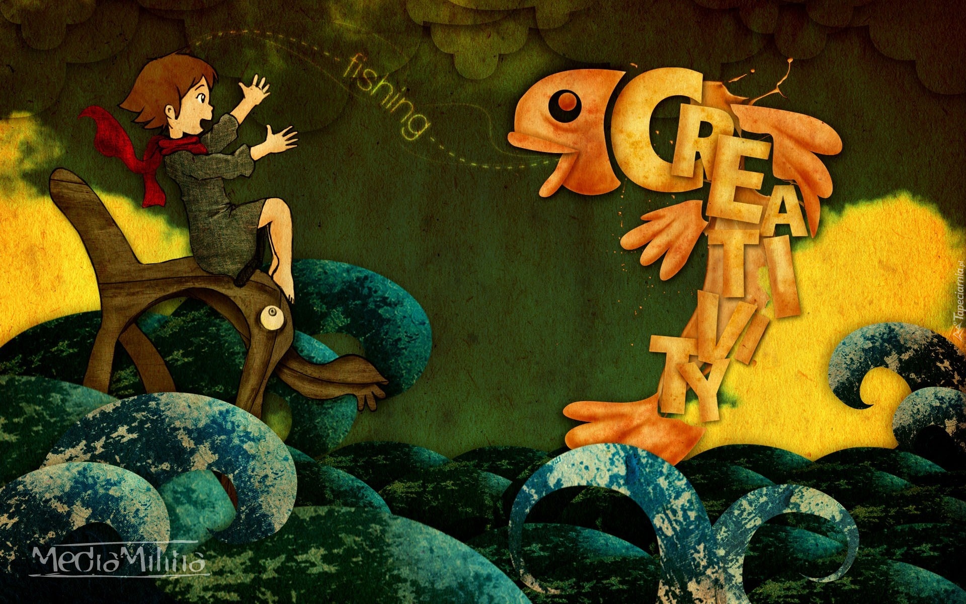 Edytor tapety: Dziewczynka, Krzesło, Ryba, Napisy, Fale, Grafika 2D