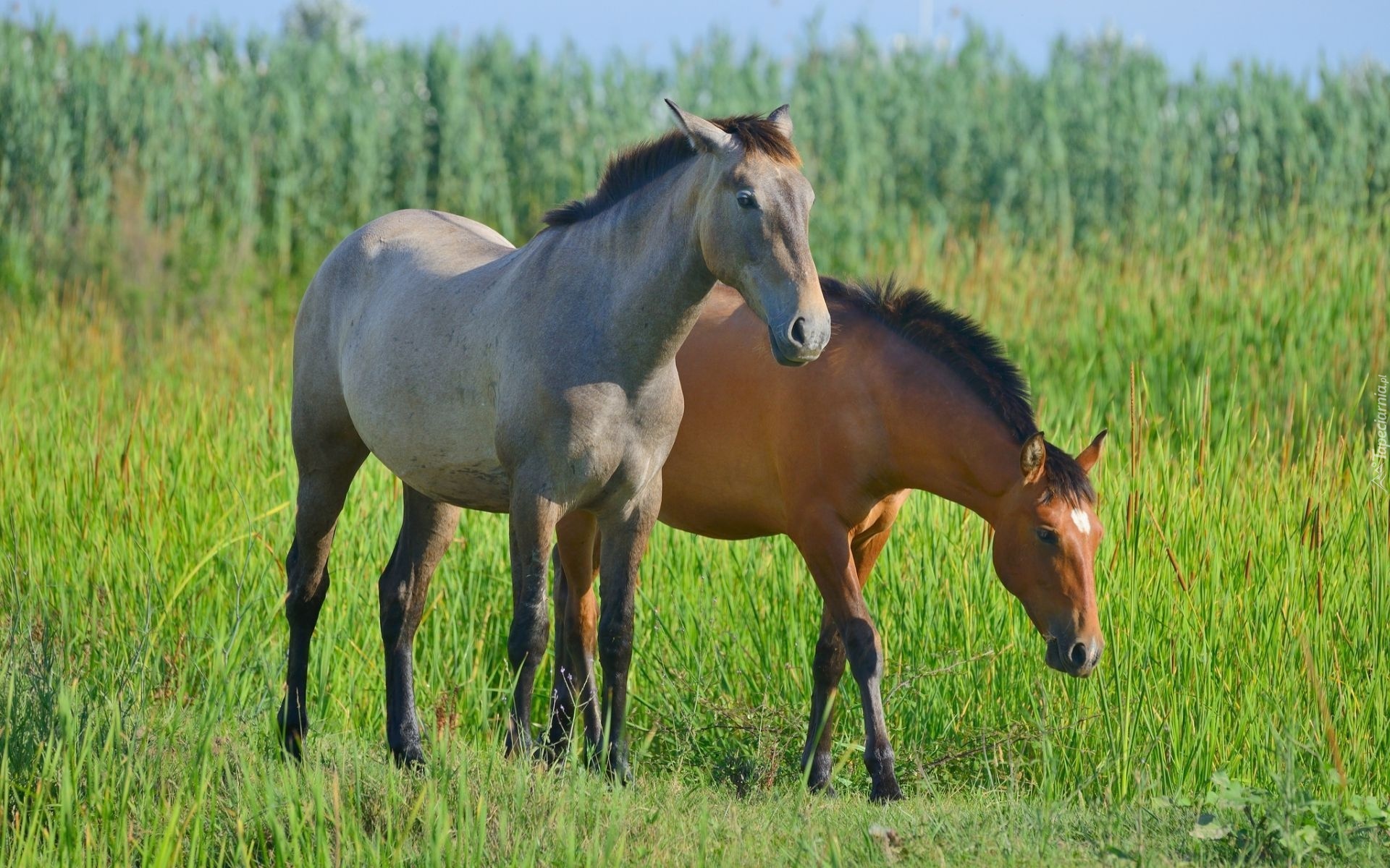 Edytor tapety: Dwa, Konie, Trawa, Zieleń