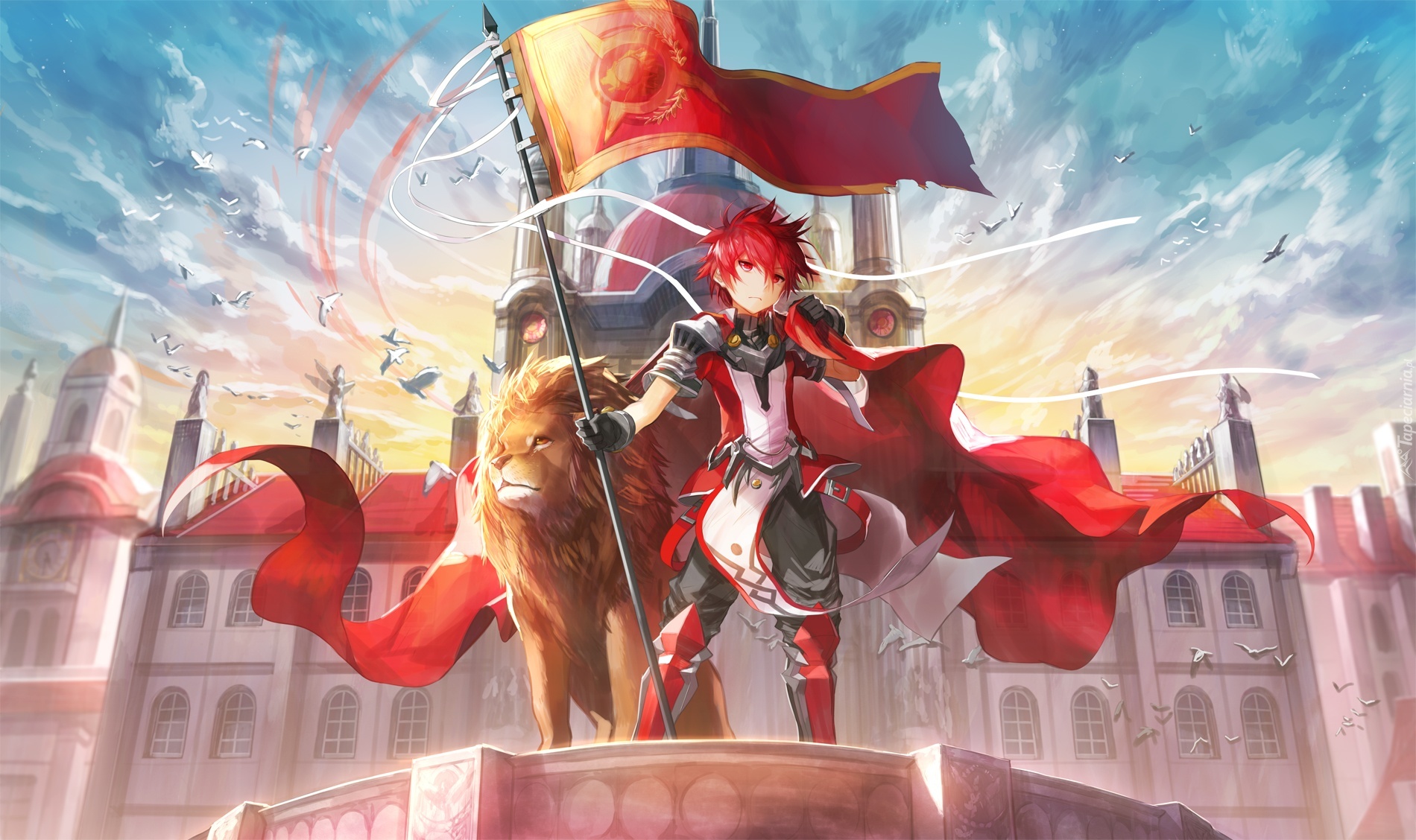 Edytor tapety: Elsword, Lew, Miasto, Flaga, Czerwony, Zbroja, Niebo, Ptaki