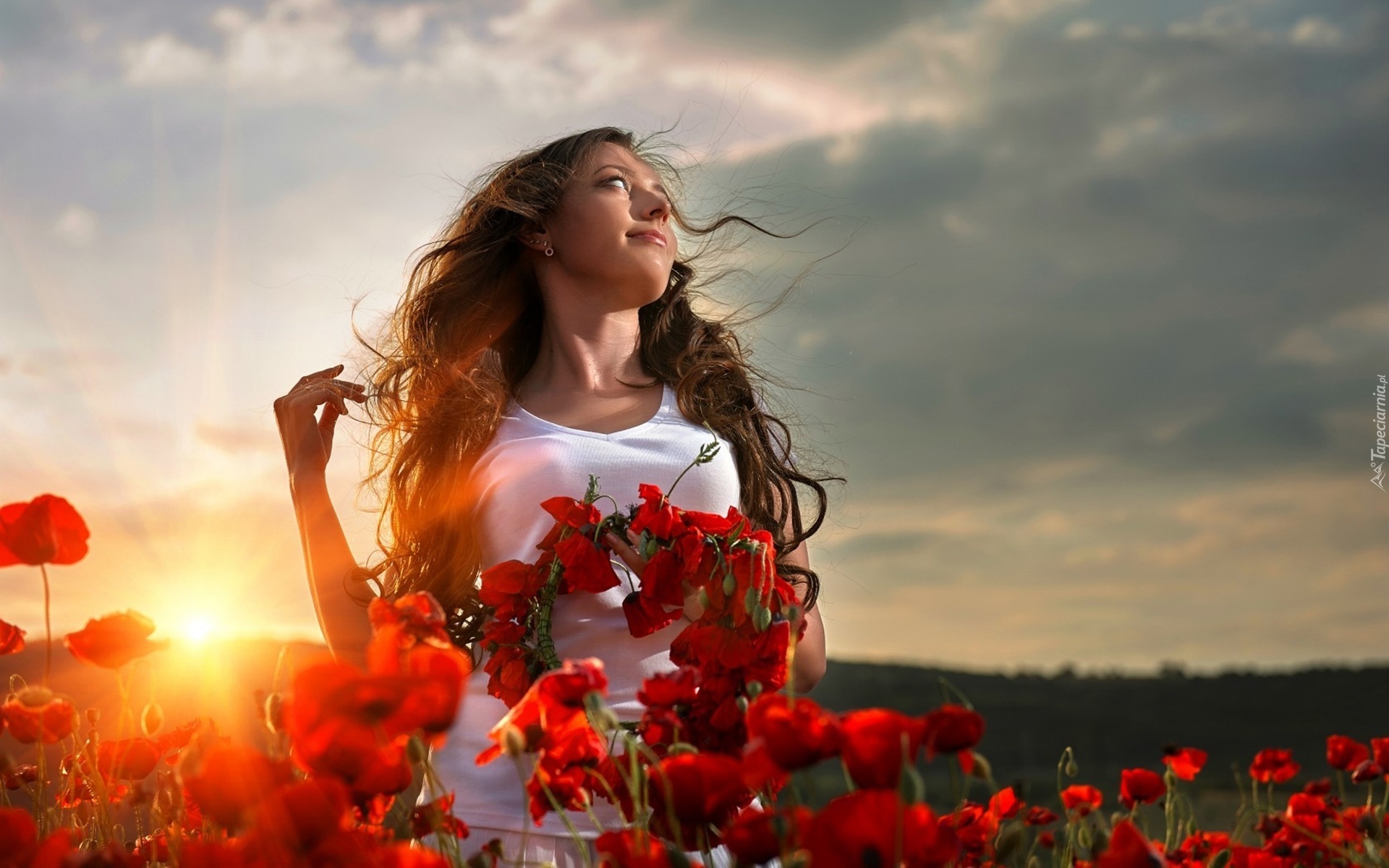 Edytor tapety: Kobieta, Maki, Wschód, Słońca