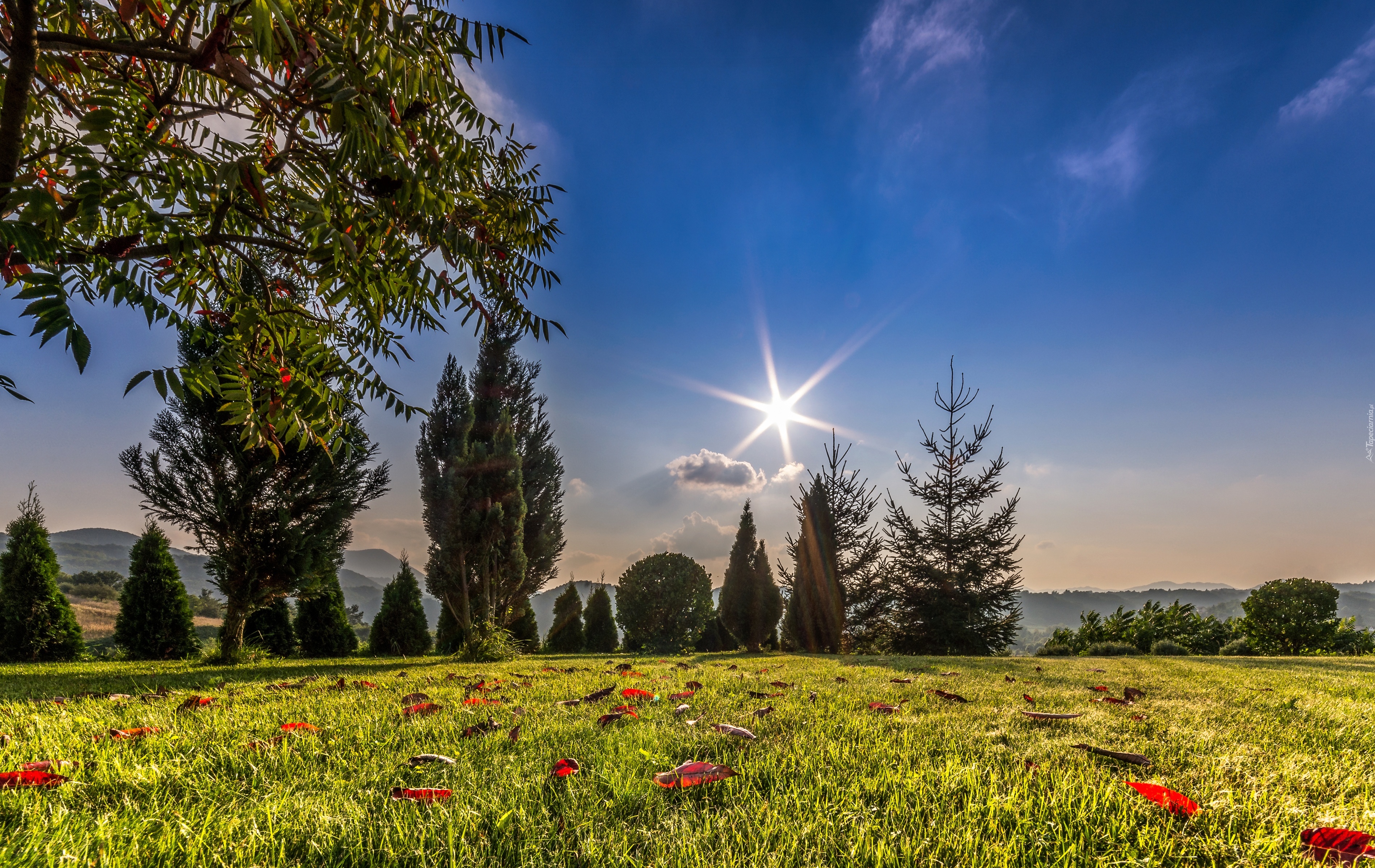 Edytor tapety: Niebo, Promienie, Słońca, Drzewa, Łąka, Chorwacja
