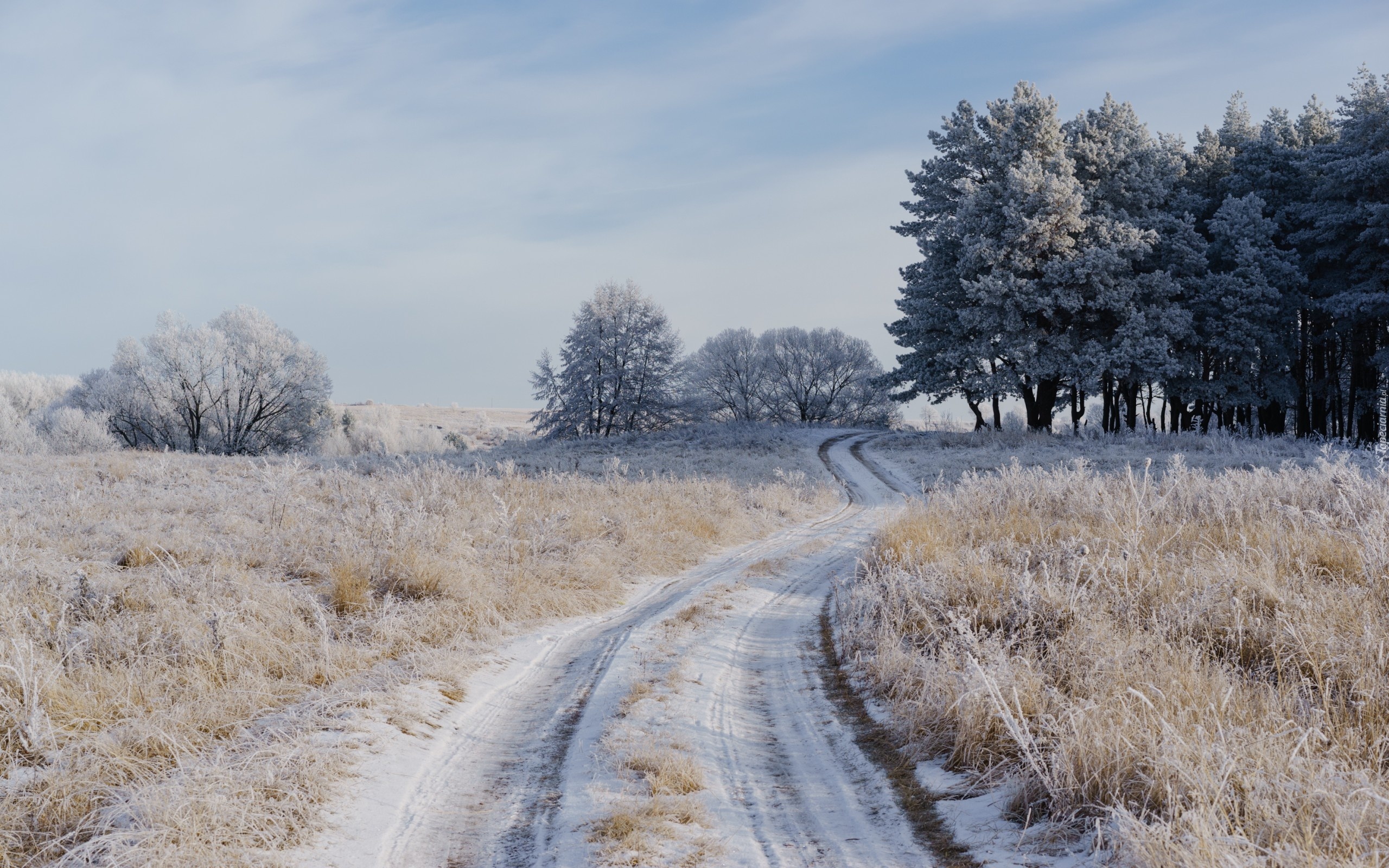 Edytor tapety: Zima, Droga, Oszronione, Pola, Drzewa