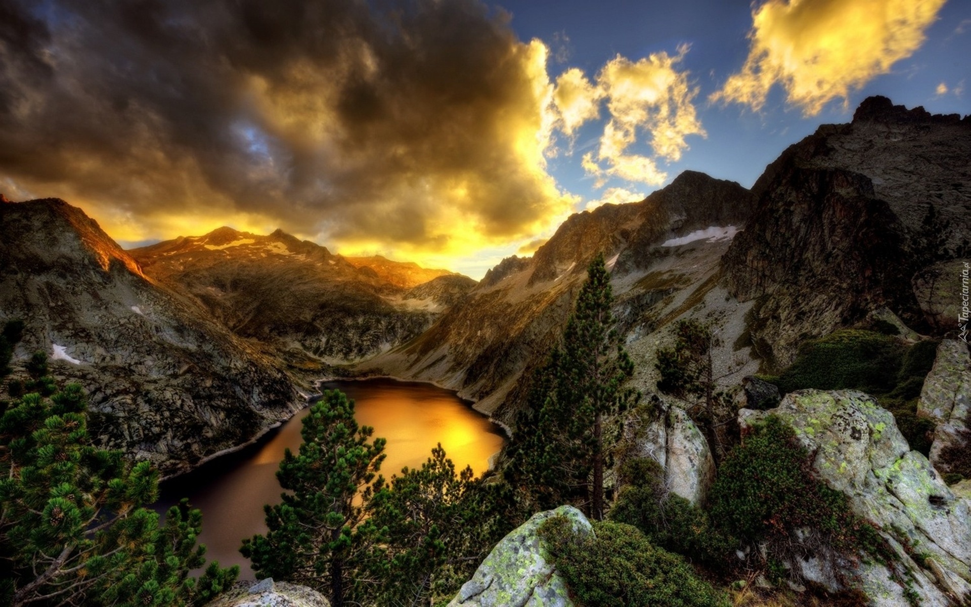 Edytor tapety: Góry, Jezioro, Chmury, Drzewa