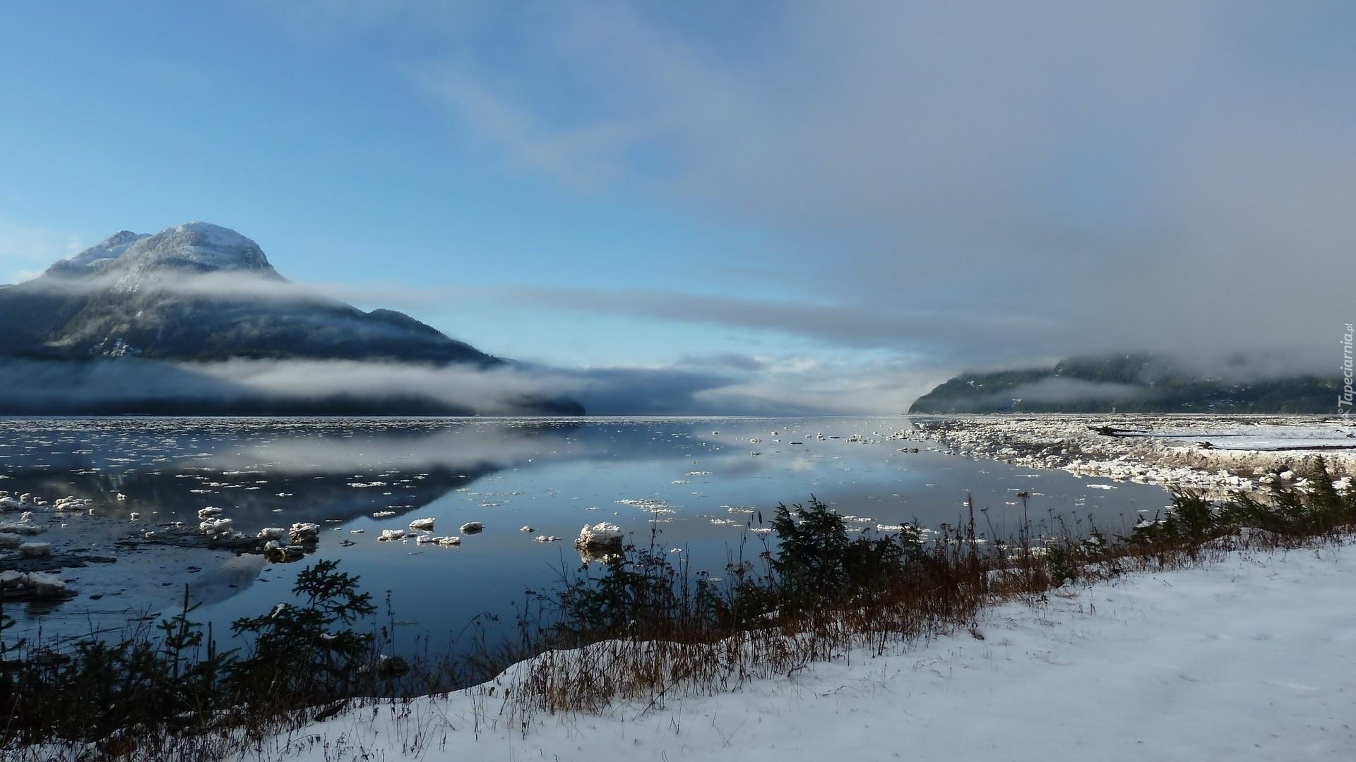 Edytor tapety: Zima, Góry, Jezioro, Chmury, Iglaki