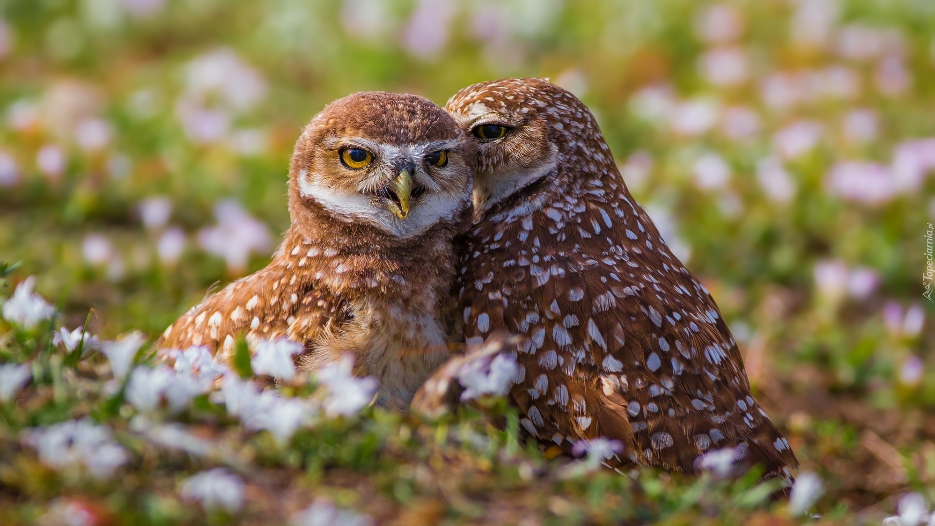 Edytor tapety: Dwie, Młode, Sówki, Pójdźki, Łąka, Trawa