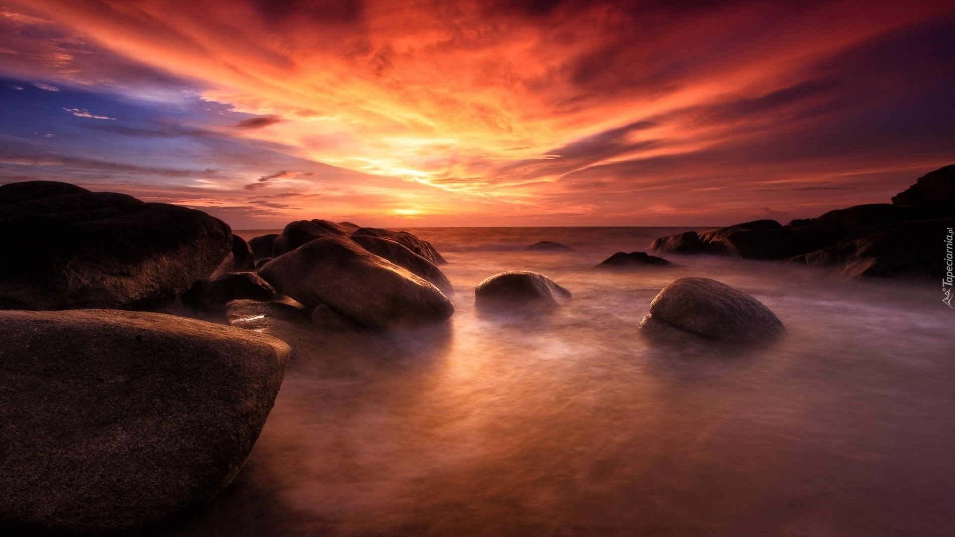 Edytor tapety: Morze, Zachód słońca, Kamienie