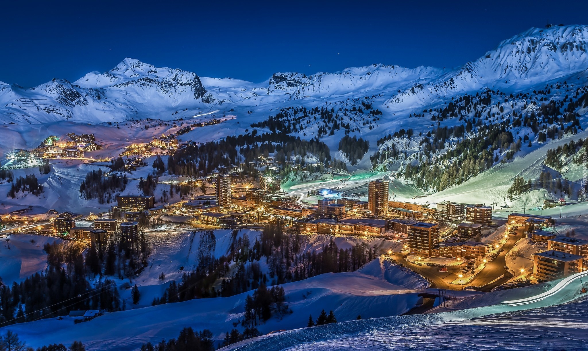 Edytor tapety: Zima, Góry, Noc, Osiedle, Kamienice