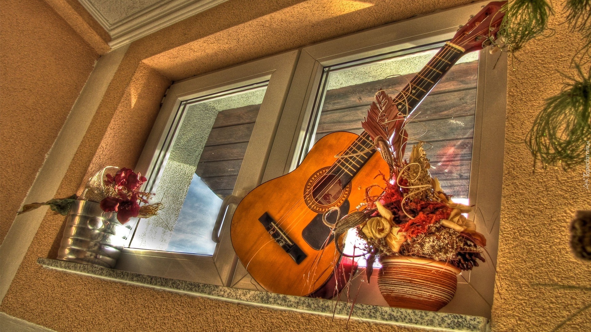 Edytor tapety: Okno, Gitara, Dekoracja, Suszone, Kwiaty