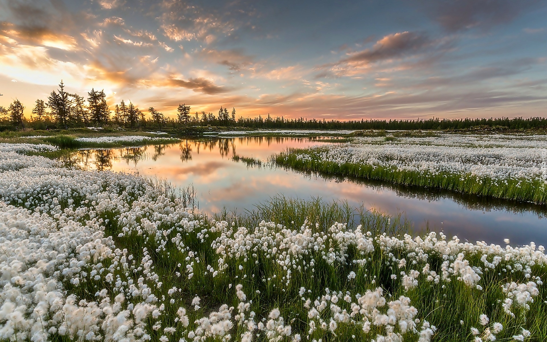 Edytor tapety: Rzeka, Brzeg, Białe, Kwiaty, Wschód Słońca