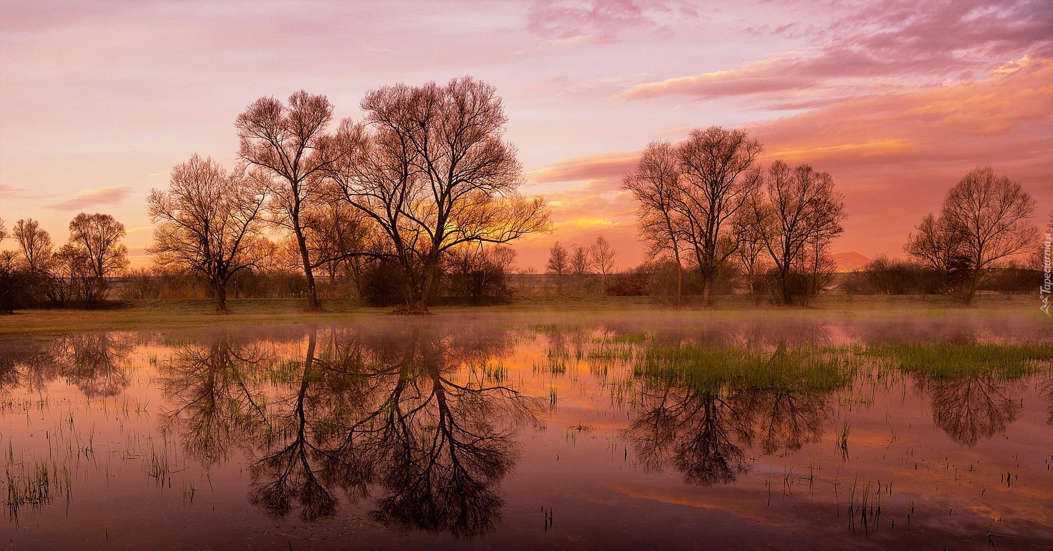 Edytor tapety: Drzewa, Jezioro, Wschód, Słońca, Odbicie