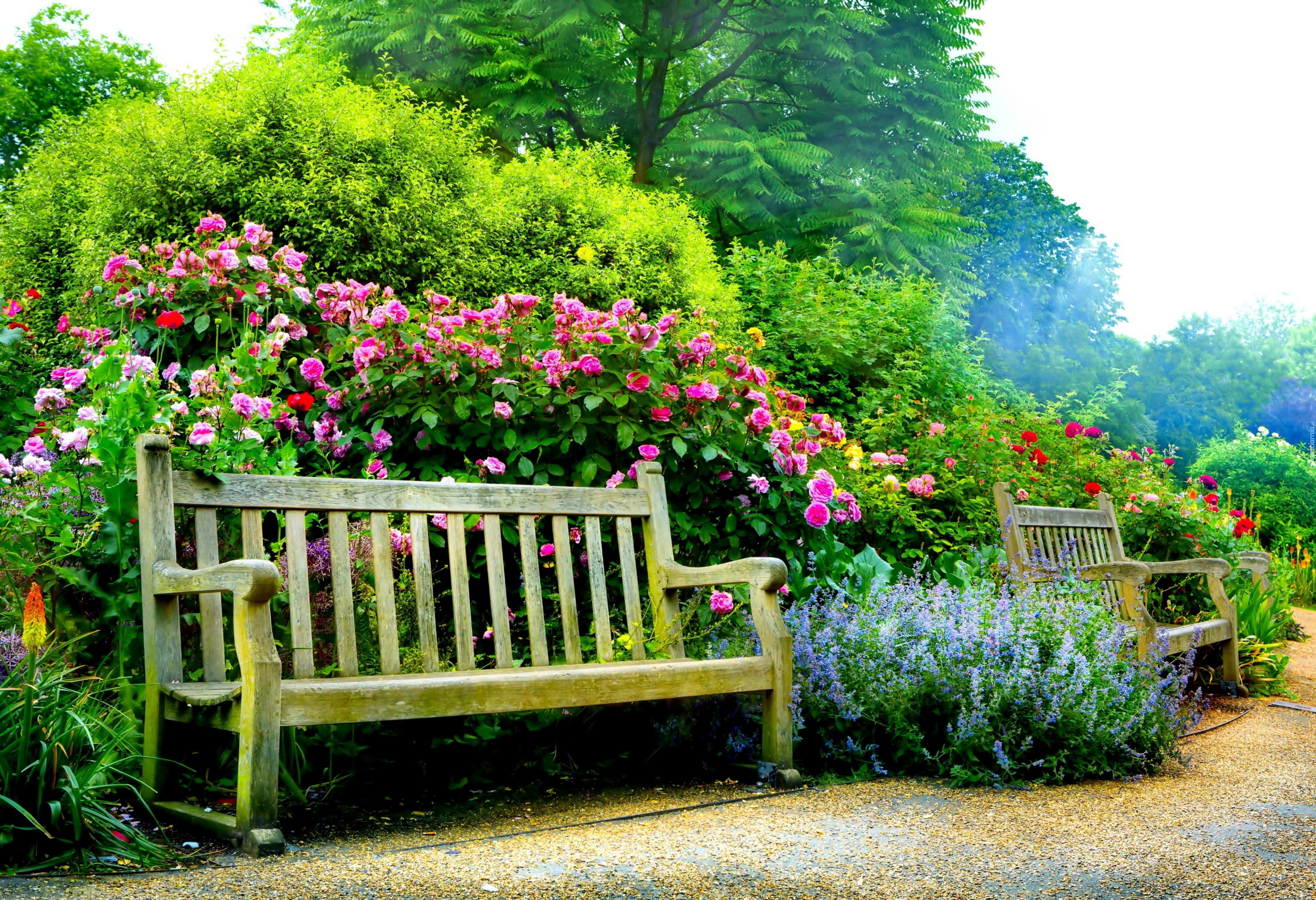 Edytor tapety: Ogród, Ławki, Drzewa, Krzewy, Róże