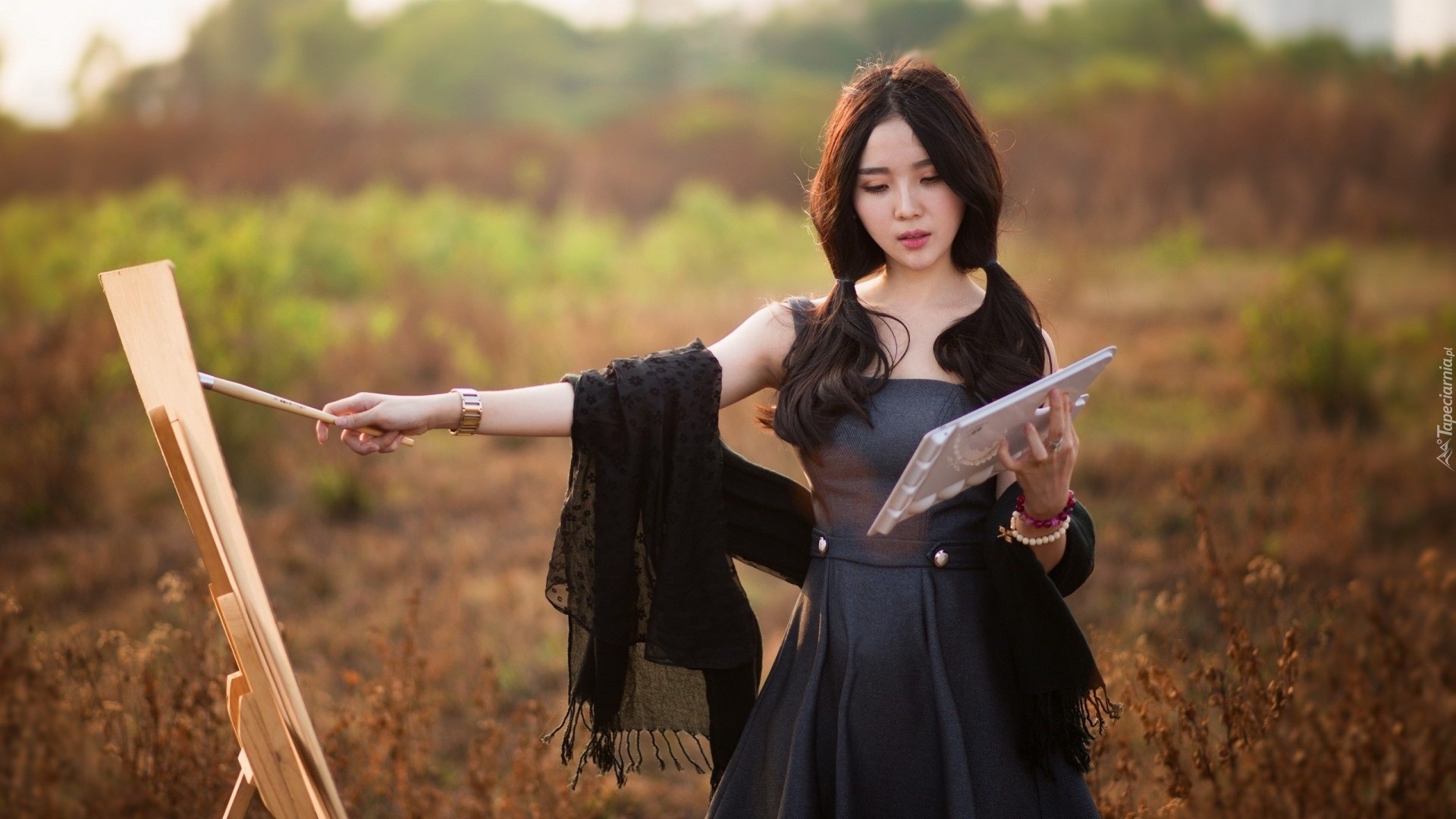Edytor tapety: Dziewczyna, Szal, Biżuteria, Paleta, Malarska, Pędzel, Sztaluga