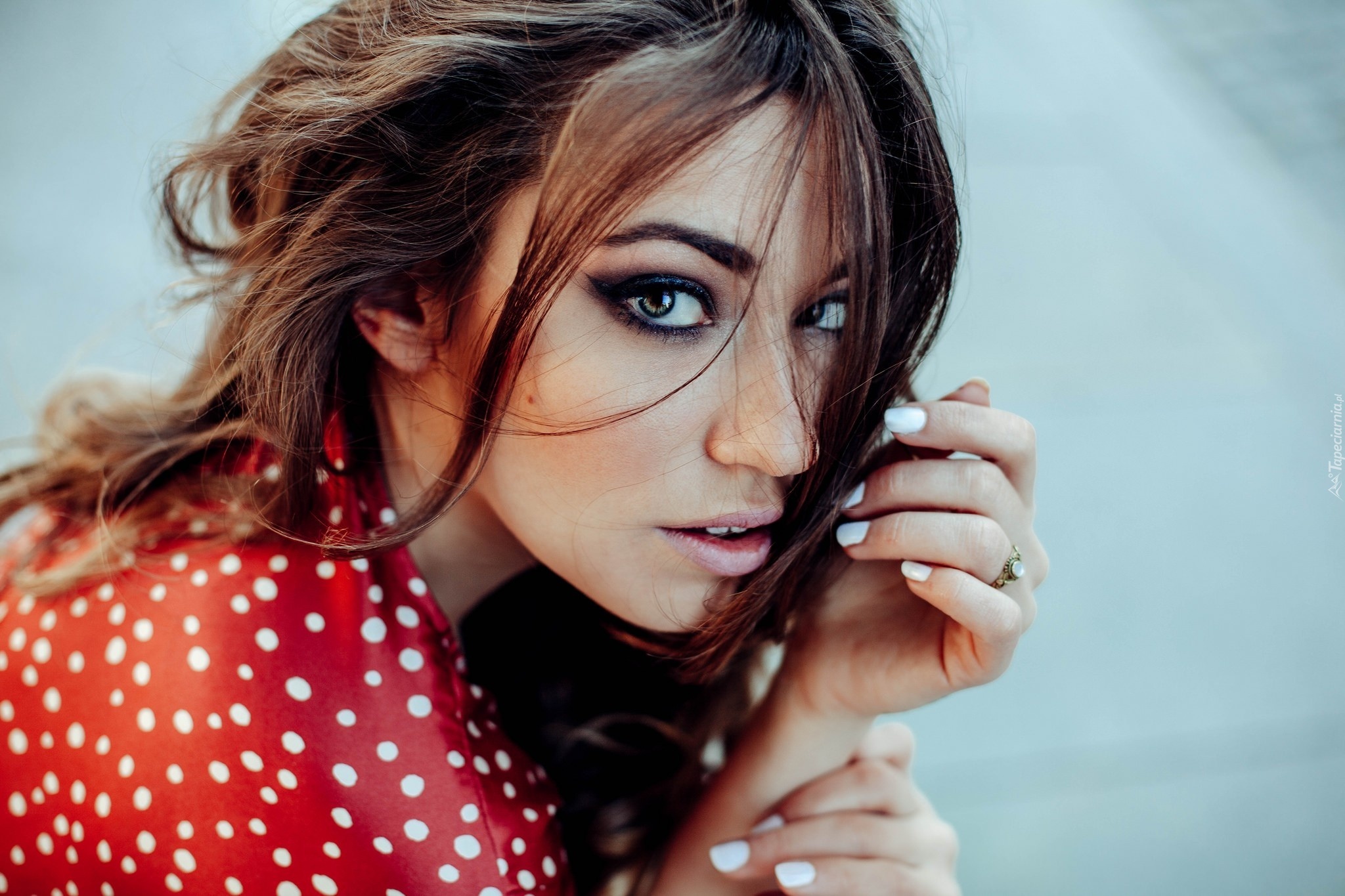 Edytor tapety: Kobieta, Bluzka, Czerwona, Białe, Kropki