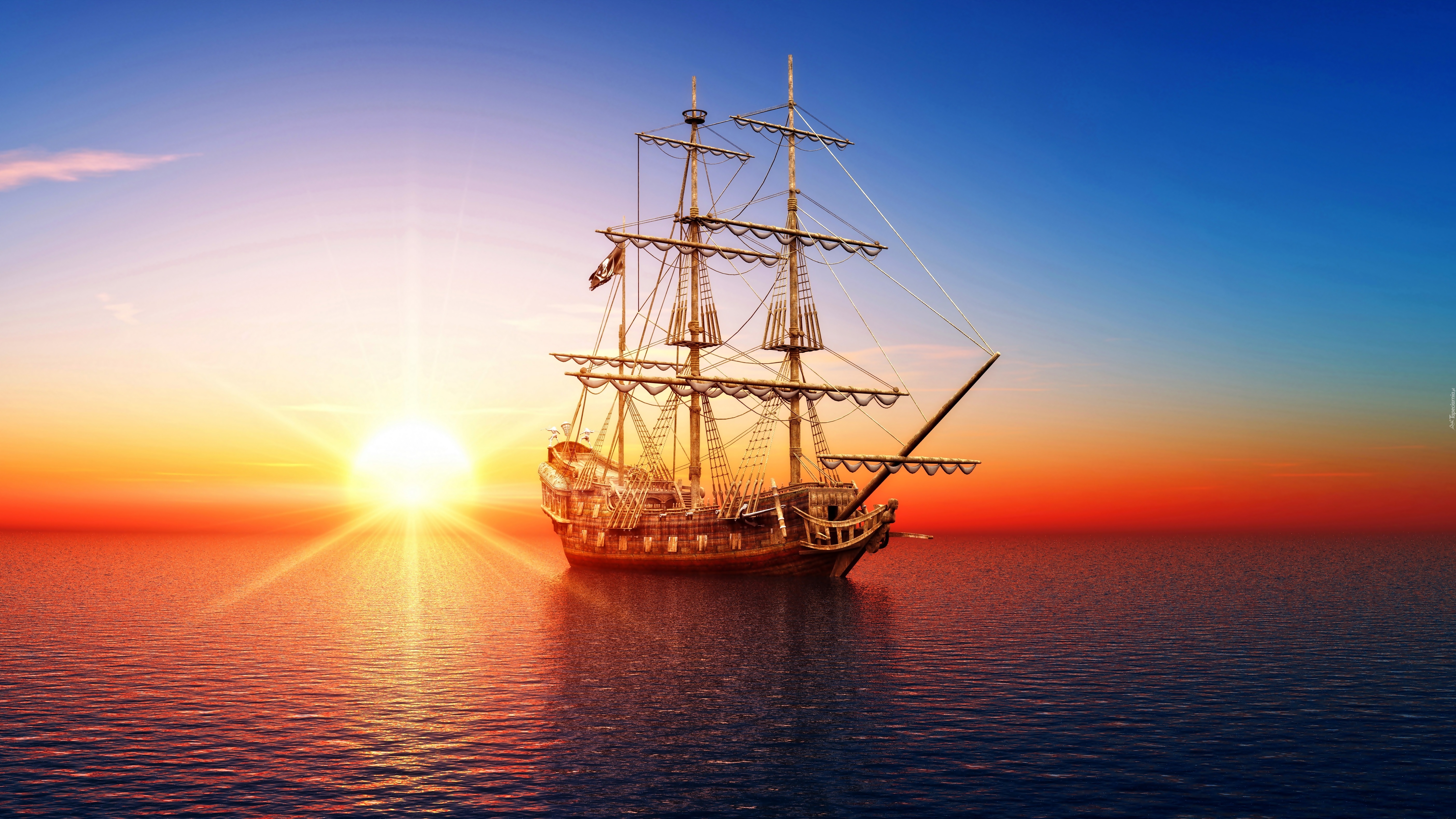 Edytor tapety: Żaglowiec, Flaga, Piracka, Morze, Wschód, Słońca