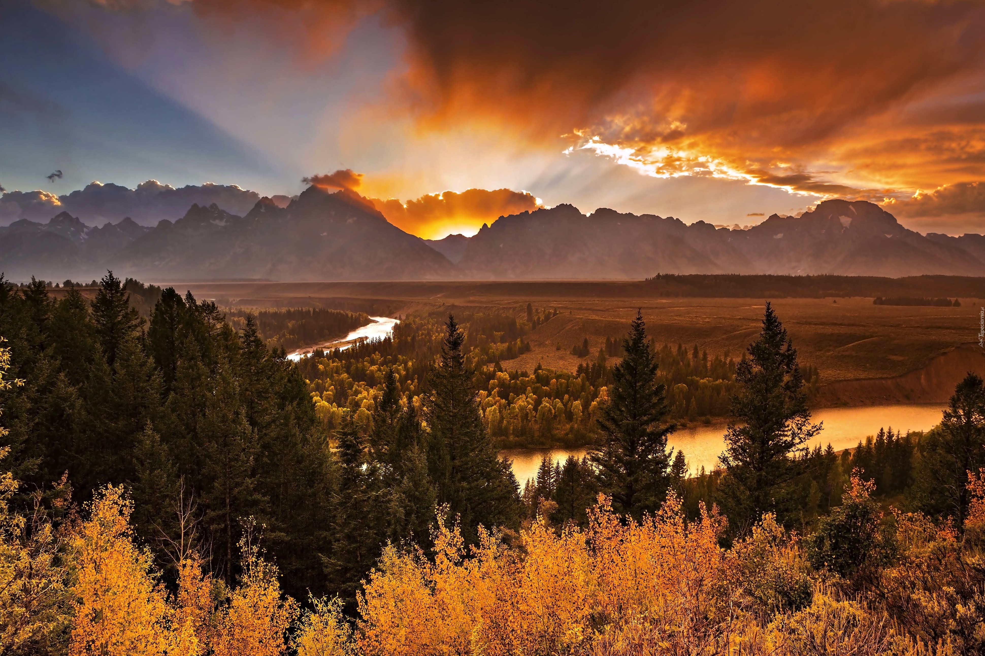 Edytor tapety: Jesień, Las, Rzeka, Góry, Chmury, Przebijające, Światło