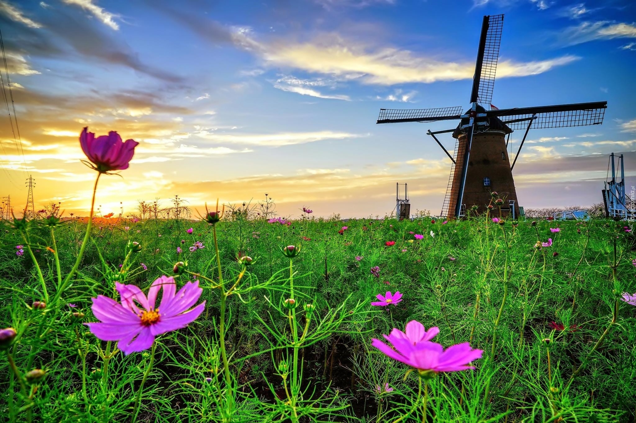 Edytor tapety: Wiatrak, Łąka, Kwiaty, Kosmea, Zachód, Słońca